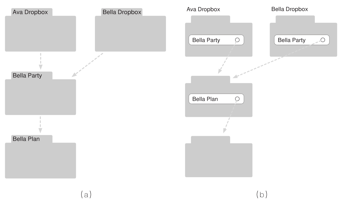 如图1-4b所示,艾娃和贝拉每个人都有自己的Dropbox根文件夹,并且她们各自的这两个文件夹对于独立且被共享的“贝拉派对”文件夹都有各自的条目入口。贝拉重命名“贝拉派对”将会改变她自己Dropbox文件夹中的条目,而艾娃文件夹中的条目没有改变。