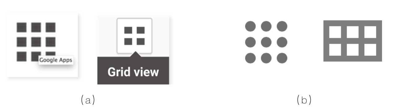 一般来说,当用户界面的设计师谈论对一致性的需求时,他们通常指的就是语言层次上的语言使用。一致性包括确保在整个用户界面中,对相同的词语采用了相同的使用方式。例如,文件容器不应该在一个系统中既被称为“文件夹”,又被称为“目录”,并且图标的使用要有系统性的考虑。图1-7展示了谷歌的图标设计如何违反了一致性原则。谷歌为两个不同的功能设计了几乎相同的图标(几年后谷歌解决了这个问题)。这两个图标都用了一组黑色方块,但其中一个对应的功能是打开谷歌的软件,另一个对应的功能则是切换到网格视图。