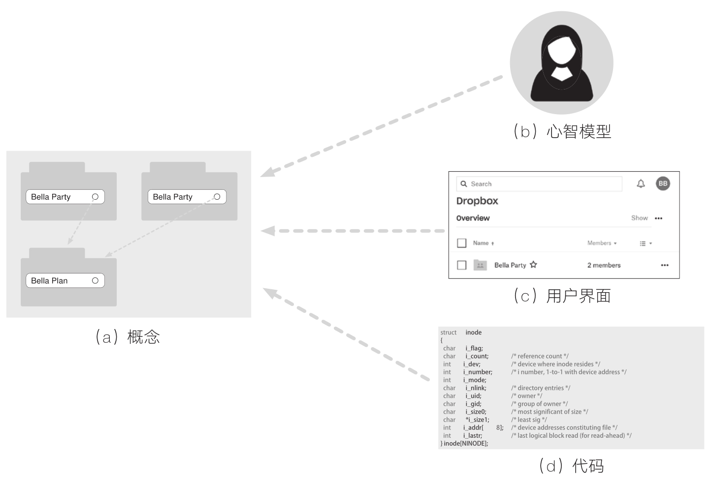 注:概念(图a)的核心作用,在于能够使用户的心智模型(图b)和开发人员的心智模型(图d)保持一致。通过仔细地将概念映射到用户界面(图c),这些概念不仅得到了完全的表达,而且还隐含地传递给了用户。