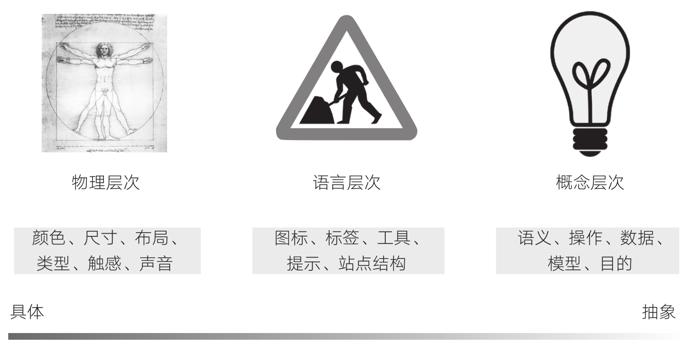 ► 软件设计在三个层次上得以实现:物理层次,包括设计按键、布局和手势,这个层次对应用户的物理和认知能力;语言层次,包括设计与用户交流的图标、提示信息和术语;概念层次,包括将底层行为设计为一系列概念。较低的两个层次,即物理层次和语言层次,主要关注用户界面中的概念表达。
