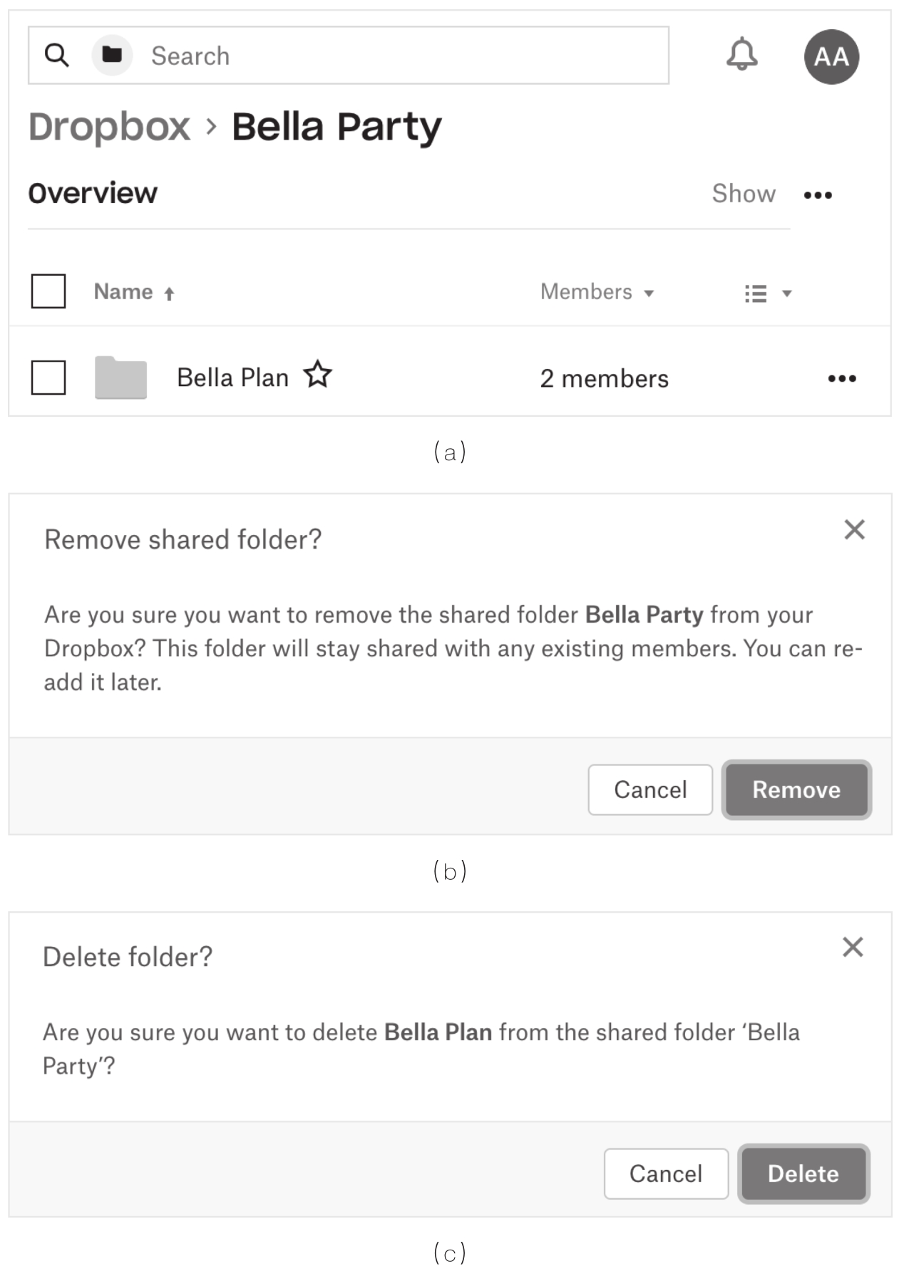 在解释具体原因之前,我们再来考虑一个问题。如果贝拉删除一个文件夹会发生什么?艾娃那里的副本也会被删除吗?同样,这取决于具体情况。如果贝拉删除了“贝拉派对”,只有她自己的那个文件夹会消失,但如果她删除的是“贝拉计划”,艾娃的文件夹也会被删除。Dropbox确实在这两种情况下给出了不同的提示信息,其中一个提示信息更全面(见图1-3b)。但奇怪的是,这一更全面的解释是在第一种情况下给出的,而不是第二种情况,可是第二种情况中的删除会导致文件永久丢失。