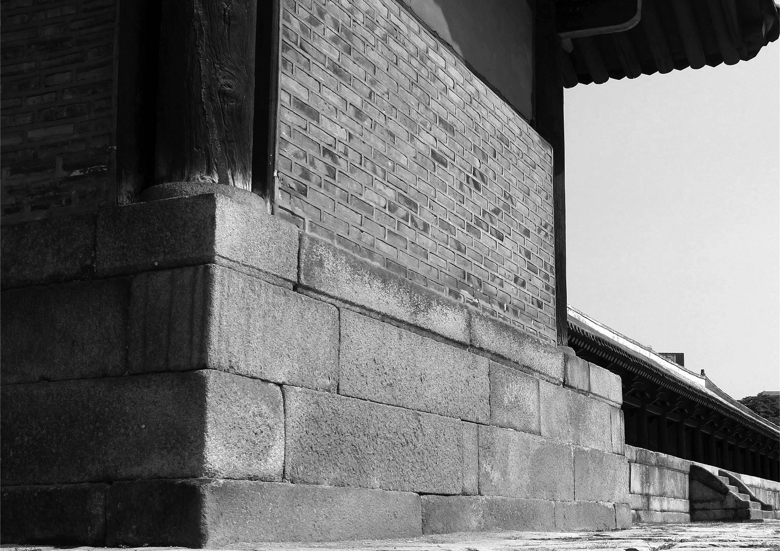 台基露明部分之下,先用石平垫在下面,其上皮比地面高出一两寸,称土衬石。土衬石的外边比台基宽出约二三寸,成为金边。台基四角转角处有角柱石;四周沿边上面平铺的石面谓之阶条石。阶条之下,土衬之上,是斗板石(亦名陡板)。这许多部分,若是没有石头时,都可以用砖替代(图六十八至图七十)。