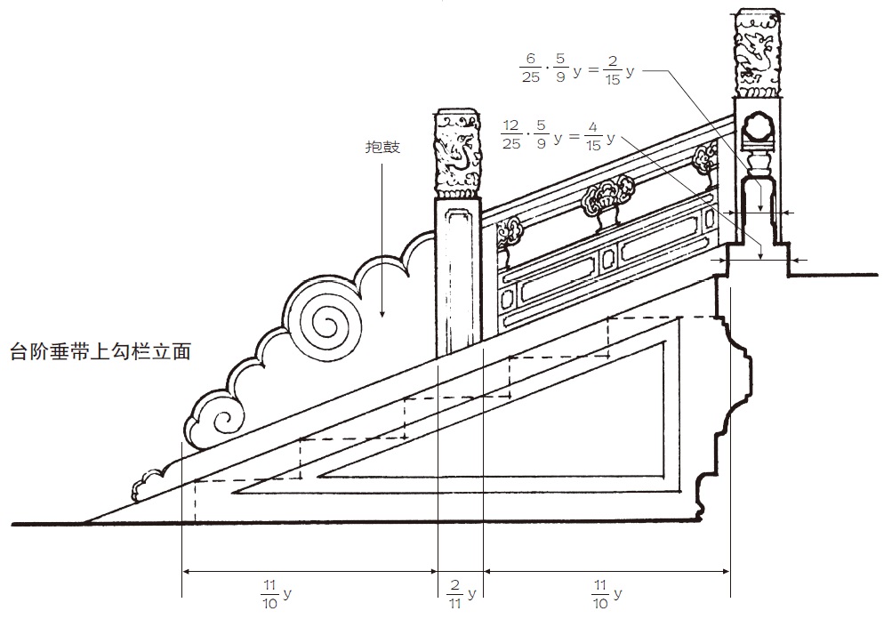 由地面走上台基须有台阶,以为上下之道。最通常的做法,在中间安一级一级的阶石称踏跺,踏跺的最下一级,只略比地面高出,而与土衬平,称砚窝石。踏跺两旁,依阶级的斜度安斜下的石面称垂带石。垂带石下三角形部分称象眼——凡在其他类似的地位的三角形都叫“象眼”。象眼之下的土衬石称平头土衬。