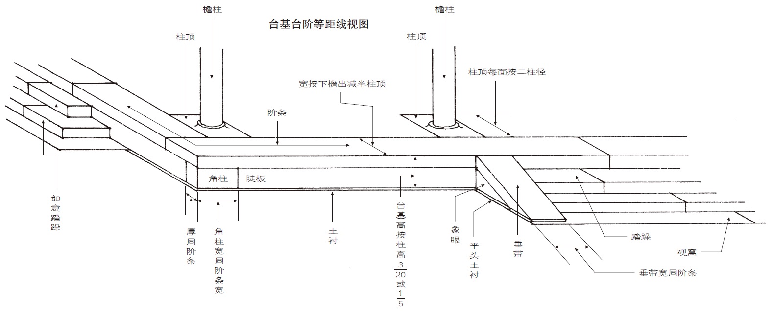 台基四周在柱中线以外的部分,谓之下檐出;若四周有廊,则下檐出宽按上檐出之五分之四,这少去的五分之一的尺寸,谓之回水,若两山山墙,则按柱径二份。台基之高则按柱高百分之十五。