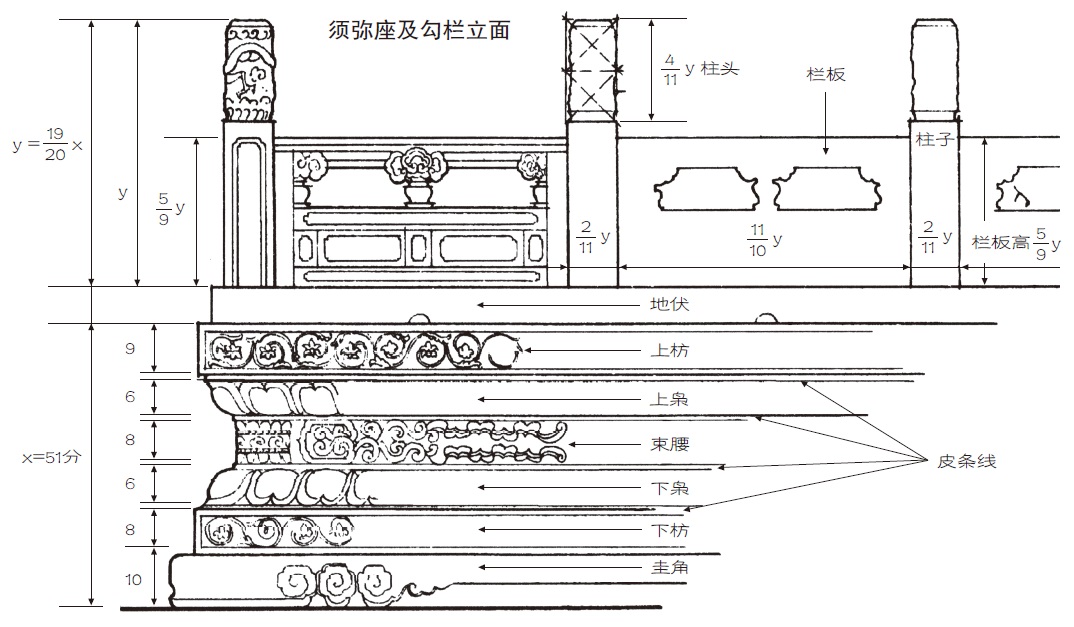 在较大较考究的建筑中,台基可以做成须弥座(图七十一及图七十二)。须弥座各部的位置与尺寸都有规定。其各部名称,由下往上是圭角(龟脚)、下枋、下枭、束腰、上枭和上枋。各层的高度都在图版拾柒(图六十八至图七十)注明,但是设计人不宜受这种规矩的限制。