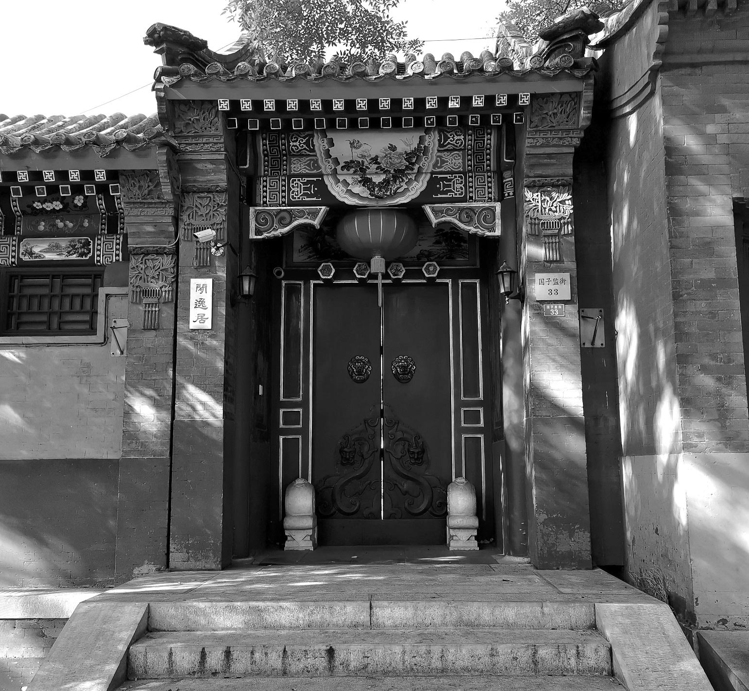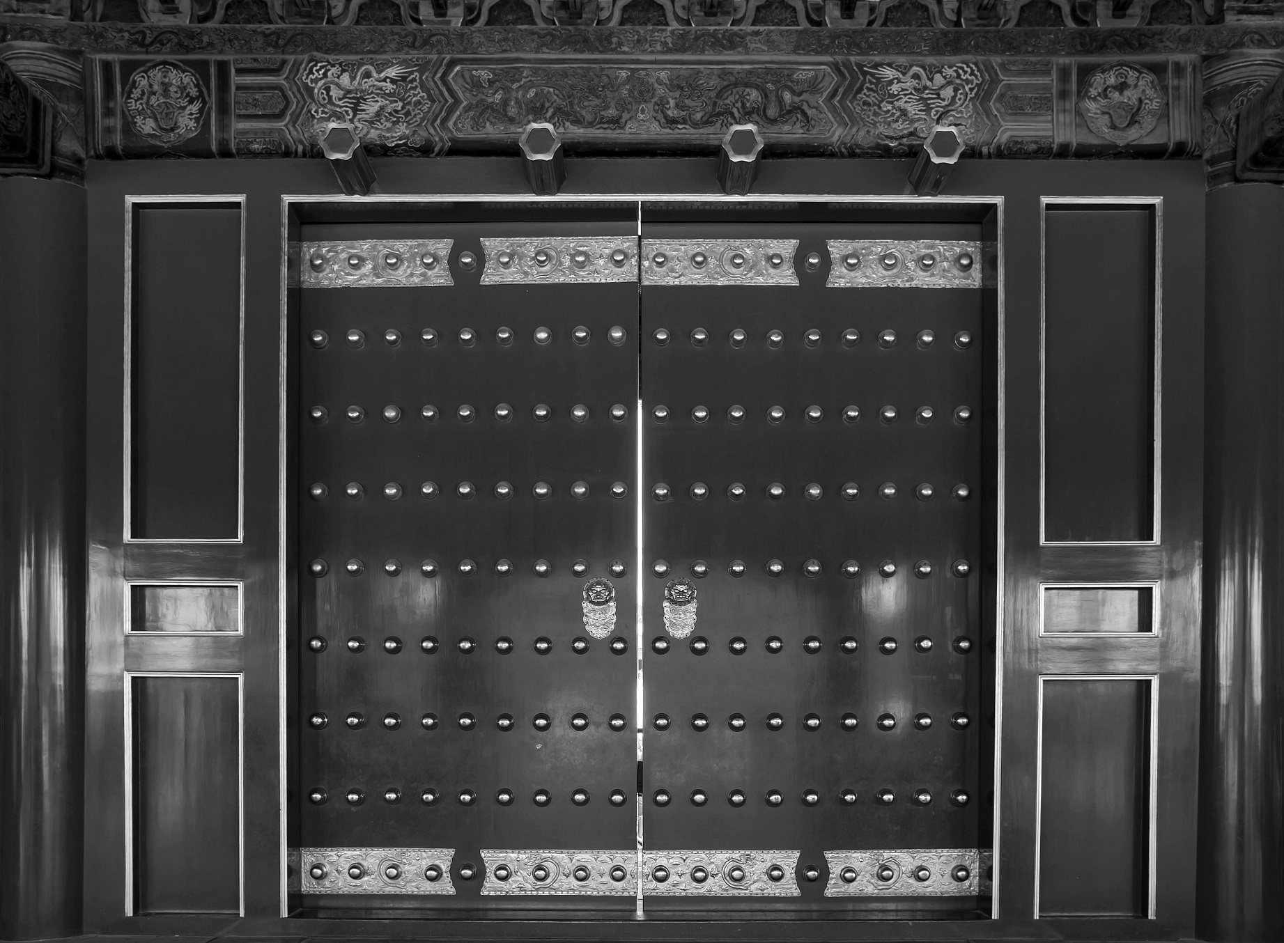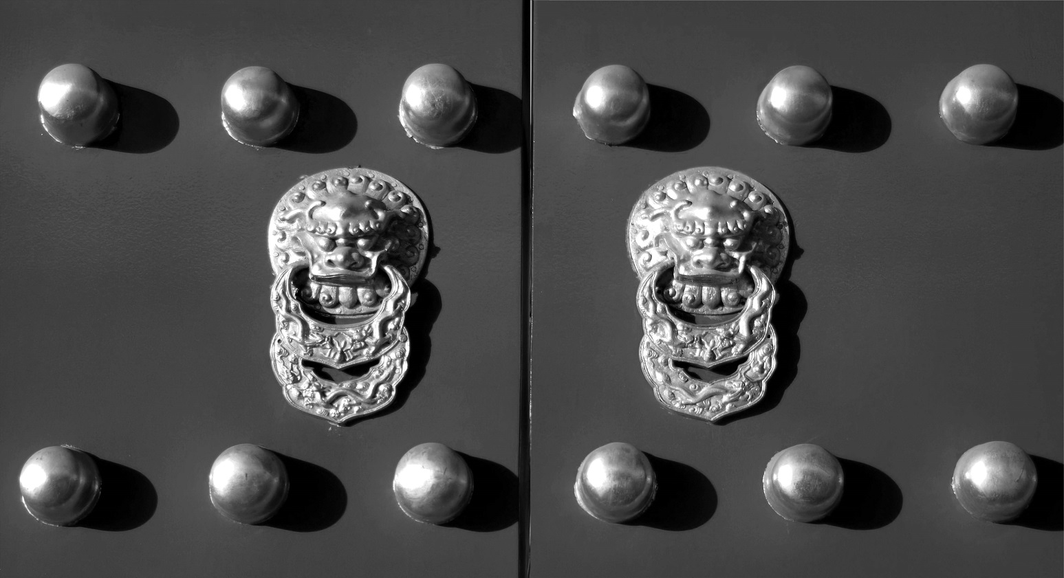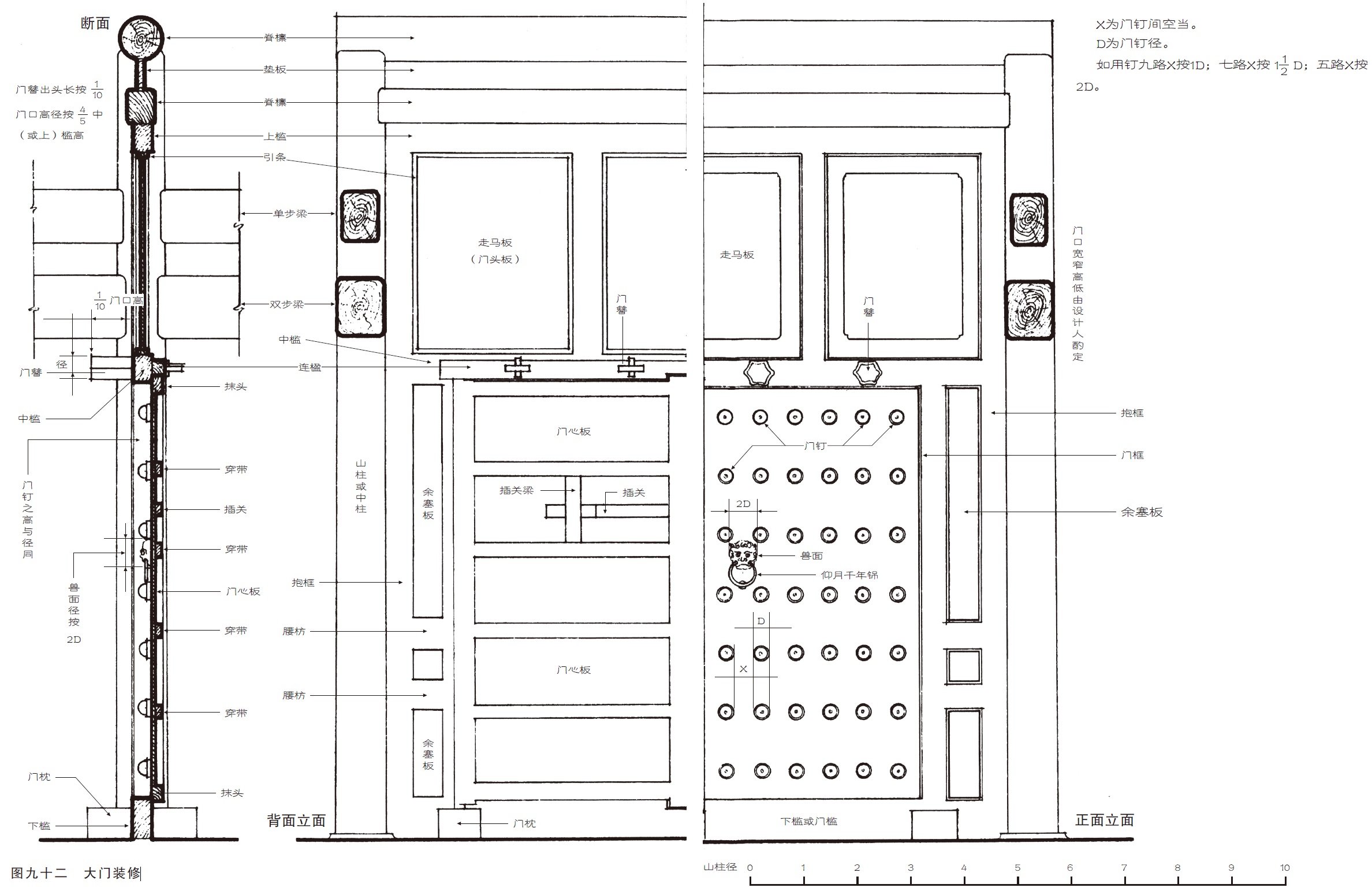 大门门扇的结构,左右竖立大边,上下端横安抹头,上下抹头之间有较小的抹头称穿带。大边与抹头一周的中间是门心板。门外安门钹,门里安插关(图九十二)。在较大的大门上,门钹的形式做成有环的钑兽面。此外还有五路、七路、九路及至十一路的门钉,可以帮助表现出凛然不可侵犯的庄严样子(图九十五)。