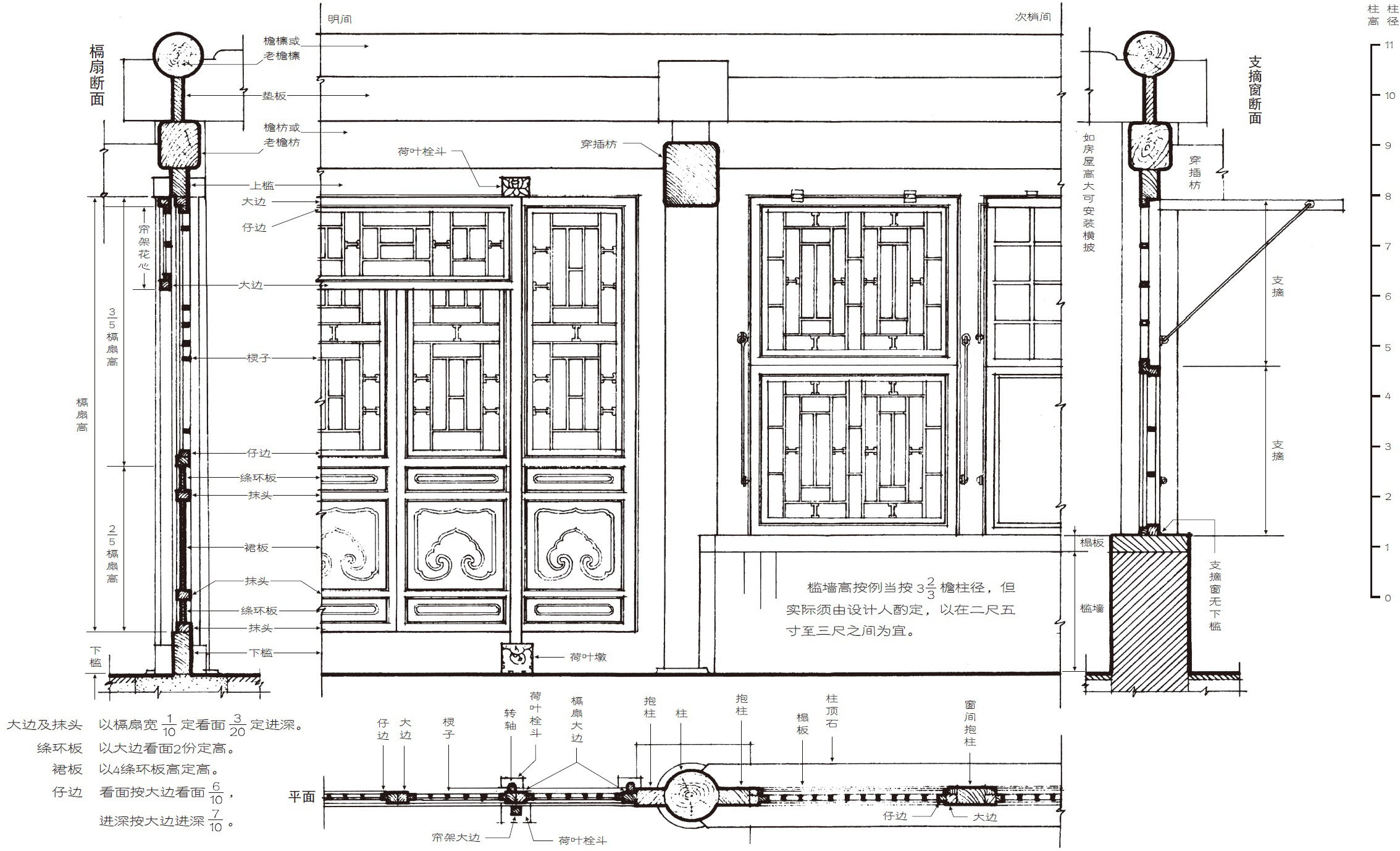 普通的窗子都做在槛墙之上。槛墙顶上先安榻板,榻板以上一切的构造都和上文所说的同,次安槛框,只是下槛较小,改称风槛。窗扇有时不像门那样左右转动,而做内外两层,上下两段,外层上段可以向上支开,下段可以摘下的,称支摘窗(图八十二及图八十八)。支摘窗没有风槛,下段直接安在榻板上;并且窗形不像槛窗的直立,而是横的。槛窗多用于宫殿庙宇,支摘窗则多用于住宅。