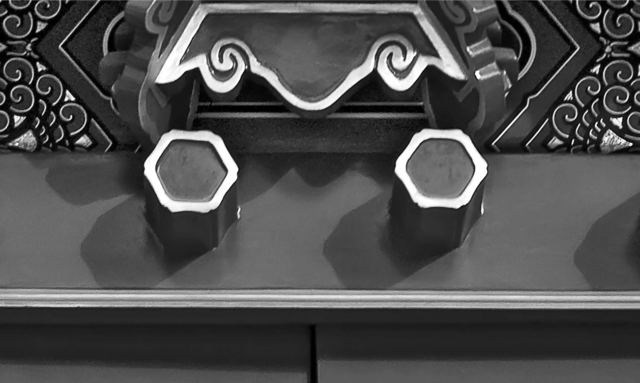 大门是一种特殊的装修(图八十九至图九十一)。槛框的构造与上文所述同。门扇的宽往往不如大门柱间面阔,所以抱框以内有时有加上门框的必要。门框与抱框间的横木为腰枋,将框间分成上下两段乃至三段,框与腰枋间的空当用板遮住,谓之余塞板。中槛以上横披所在的分位,不用槅扇而用板遮盖,称走马板。大门槛近两端处,在门扇转轴之下有门枕,有时用木,有时用石。大门的转轴上头穿在连楹里,下头立在门枕上。门枕的形式甚多,可以做成种种有趣的样子(图九十三)。中槛上有门簪,将连楹销在中槛上,外端成六角形,也是一种有趣的装饰(图九十四)。