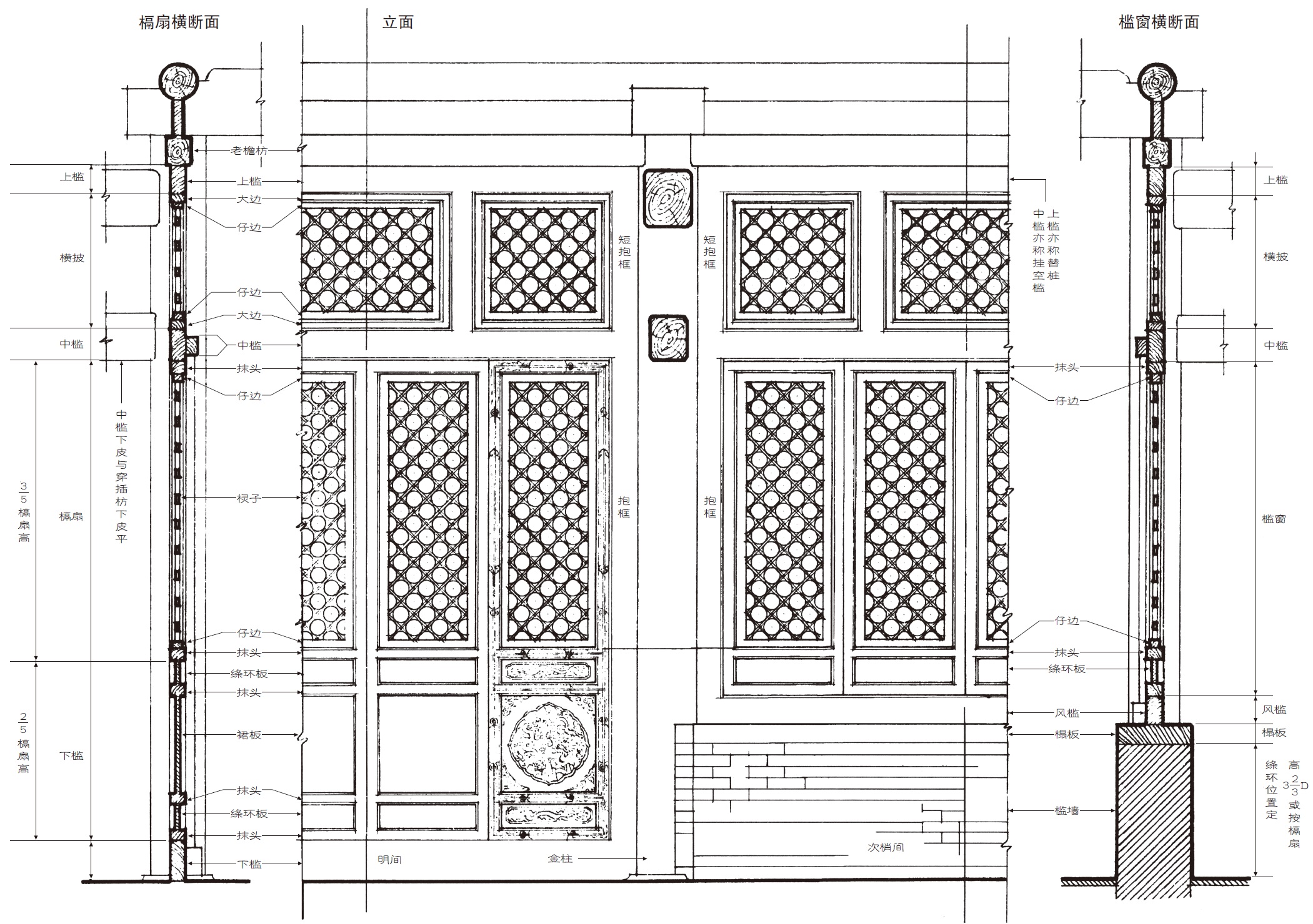 装修的本身也可分两部分——框槛和槅扇(图八十二及图八十三)。框槛是不动的部分,槅扇是可动的部分。框槛之中,横的部分都是槛,更因地位的高下,分上槛、中槛、下槛。上槛也叫替桩,紧贴在檐枋之下。中槛也叫挂空槛。下槛放在地上。左右竖立的部分叫抱框,紧靠着柱子立住。这框槛的全部就是安装槅扇的架子。普通建筑物多在中槛下槛之间安门或窗,上槛中槛之间安横披。门窗横披都是槅扇,其不同处乃在门、窗是可以启闭而横披是固定不动的。若建筑物矮小,则不用中槛,只有门窗而无横披。