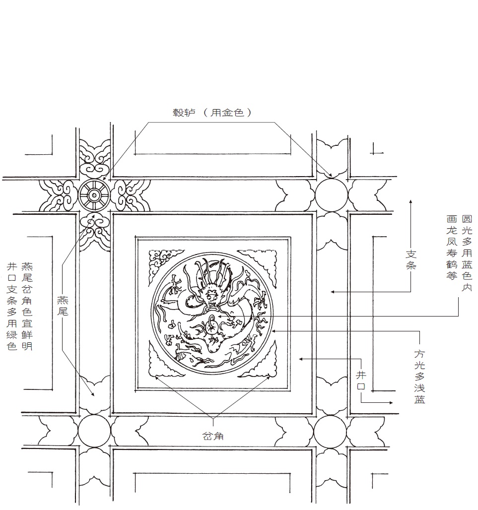 天花在《工程做法》里归在大木作之内,但是它于建筑全部的结构上没有根本的关系,功用与装修相同,所以应当归在装修项下。在天花梁或别的梁上,在高度适当处安装帽儿梁或是贴梁,然后将支条安在帽儿梁或贴梁的下面。支条按面阔进深排列成方格,每方格就是一井,井内的板叫天花板(图九十六及图九十七)。