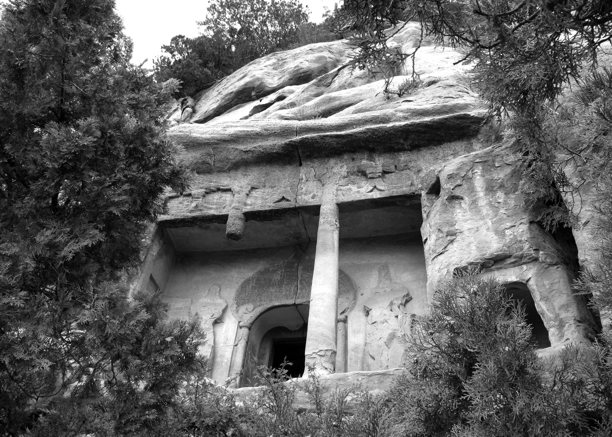 在云冈、龙门、天龙山诸石窟,我们得见六朝遗物。其中天龙山石窟,尤为完善(图三),石窟口凿成整个门廊,柱、额、斗栱、椽、檐、瓦,样样齐全。这是当时木造建筑忠实的石型,由此我们可以看到当时斗栱之形制,和结构雄大、简单疏朗的特征。