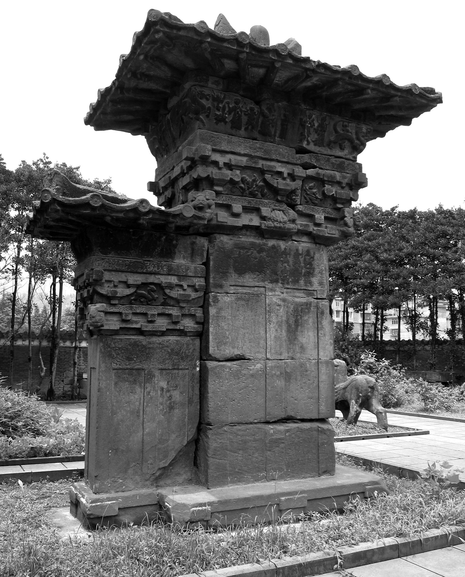 实物真正之有“建筑的”价值者,现在只能上达东汉。墓壁的浮雕画像中(图一)往往有建筑的图形;山东、四川、河南多处的墓阙(图二),虽非真正的宫室,但是用石料摹仿木造的实物(早代木造建筑,因限于木料之不永久性,不能完整存在到今日,所以供给我们研究的古代实物,多半是用石料明显的摹仿木造的建筑物,且此例不单限于中国古代建筑)。在这两种不同的石刻之中,构架上许多重要的基本部分,如柱、梁、额、屋顶、瓦饰等等,多已表现;斗栱更是显著,与两千年后的,在制度、权衡、大小上,虽有不同,但其基本的观念和形体,却是始终一贯的。