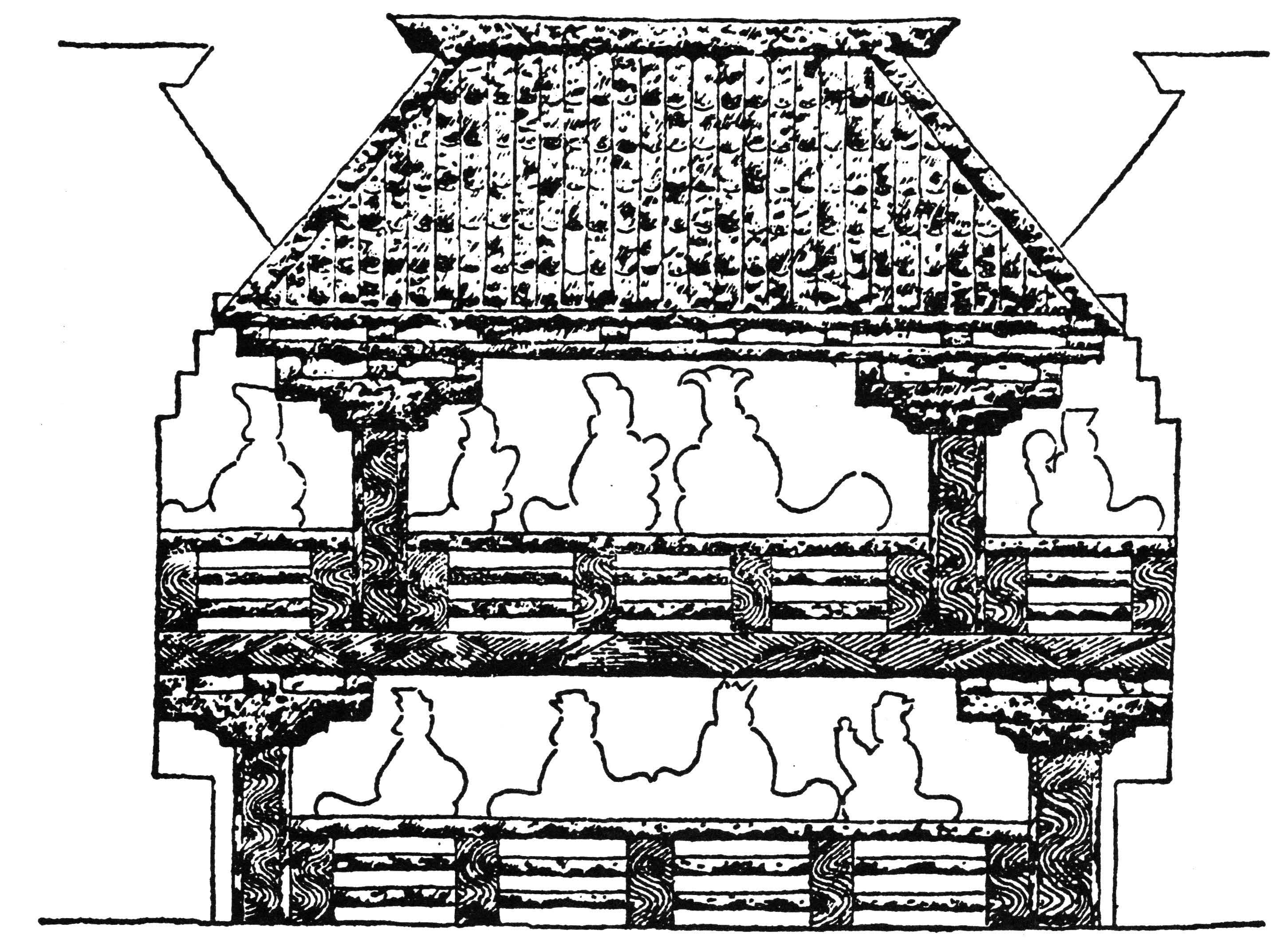 斗栱后来虽然变成构架中极复杂之一部,原始却甚简单,它的历史竟可以说与华夏文化同长。秦汉以前,在实物上,我们现在还没有发现有把握的材料,供我们研究,但在文献里,关于描写构架及斗栱的词句,则多不胜载;如臧文仲之“山节藻棁”,鲁灵光殿赋“层栌磥垝以岌峨,曲枅要绍而环句……”等。但单靠文人的辞句,没有实物的印证,由现代研究工作的眼光看去极感到不完满。没有实物我们是永没有法子真正认识,或证实,如“山节”“层栌”“曲枅”这些部分之为何物,但猜疑它们为木构上斗栱部分,则大概不会太谬误的。现在我们只能希望在最近的将来考古家实地挖掘工作里能有所发现,可以帮助我们更确实的了解。