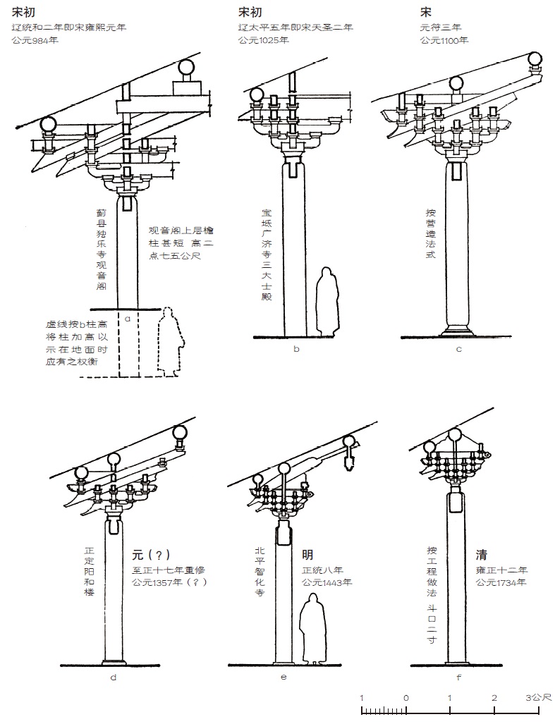 图中斗栱a及b都是辽圣宗朝物(图七),可以说是北宋初年的作品。其高度约占柱高之半至五分之二。f柱与b柱同高,斗栱出踩较多一踩,按《工程做法则例》的尺寸,则斗栱高只及柱高之四分之一。而辽清间的其他斗栱如c,d,e,f,年代逾后,则斗栱与柱高之比逾小。在比例上如此,实际尺寸亦如此。于是后代的斗栱,日趋繁杂纤巧,斗栱的功用,日渐消失;如斗栱原为支檐之用,至清代则将挑檐桁放在梁头上,其支出远度无所赖于层层支出的曲木(翘或昂)。而辽宋斗栱,如a至d各图,均为一种有机的结构,负责承受檐及屋顶的荷载。明清以后的斗栱,除在柱头上者尚有相当结构机能外,其平身科已成为半装饰品了。至于斗栱之分布,在唐画中及独乐寺所见,柱头与柱头之间,率只用补间斗栱(清称平身科)一朵(攒);《营造法式》规定当心间用两朵,次梢间用一朵。至明清以斗口十一分定攒档,两柱之间,可以用到八攒平身科,密密的排列,不止全没有结构价值,本身反成为额枋上重累,比起宋建,雄壮豪劲相差太多了。