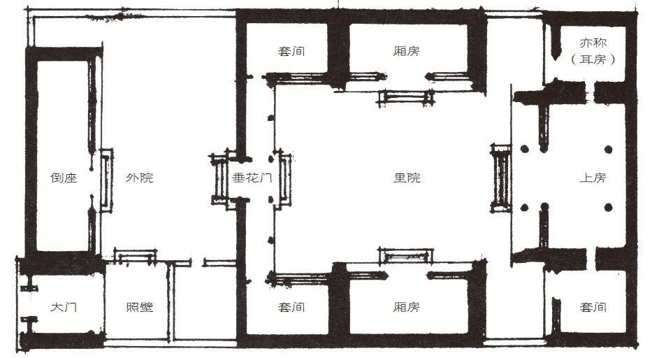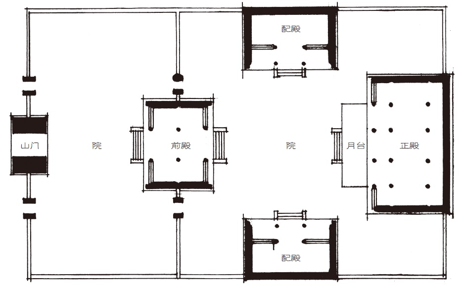 普通平面均齐的配置方法,不论宫殿庙宇或住宅,均由若干座的建筑物合成(图九及图十)。主要的建筑物居中,多南向,称正殿或正房。在正殿之前分列左右面相向者为配殿或厢房(与正殿相对者为前殿或倒座)。这四座共包括的范围称一院。一处住宅,宫殿或庙宇,多由一院或多院合成。一院之四面都有房屋者,称四合;或有例外,只有单面厢房,或无倒座,只是三面有房屋者,称三合。其他主要部分的布置,原则仍是不改。至于完全不均齐的配置,如离宫别馆,庭园斋舍,地位方向皆因地随宜设计,绝不受规例的拘束。