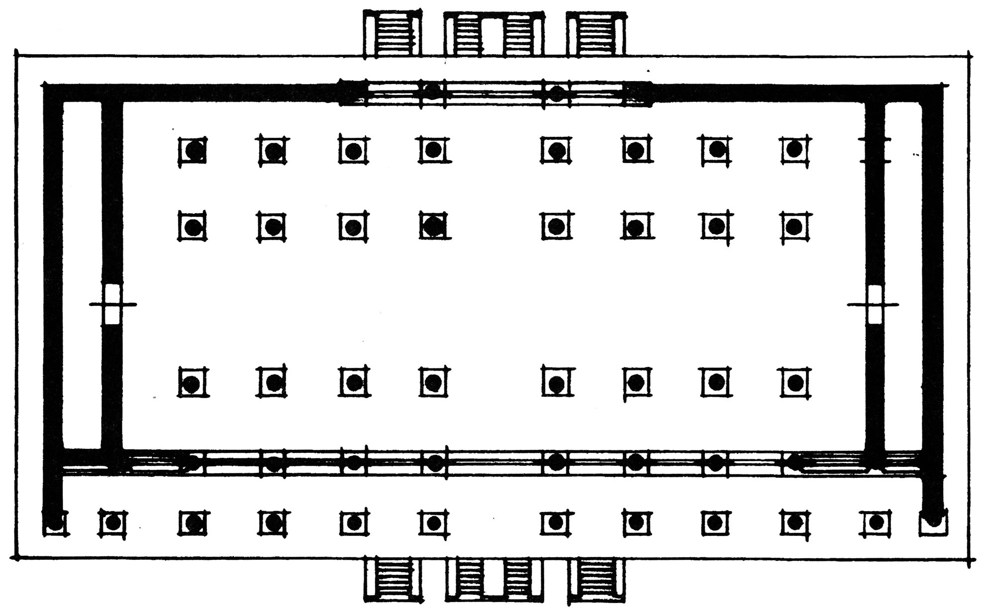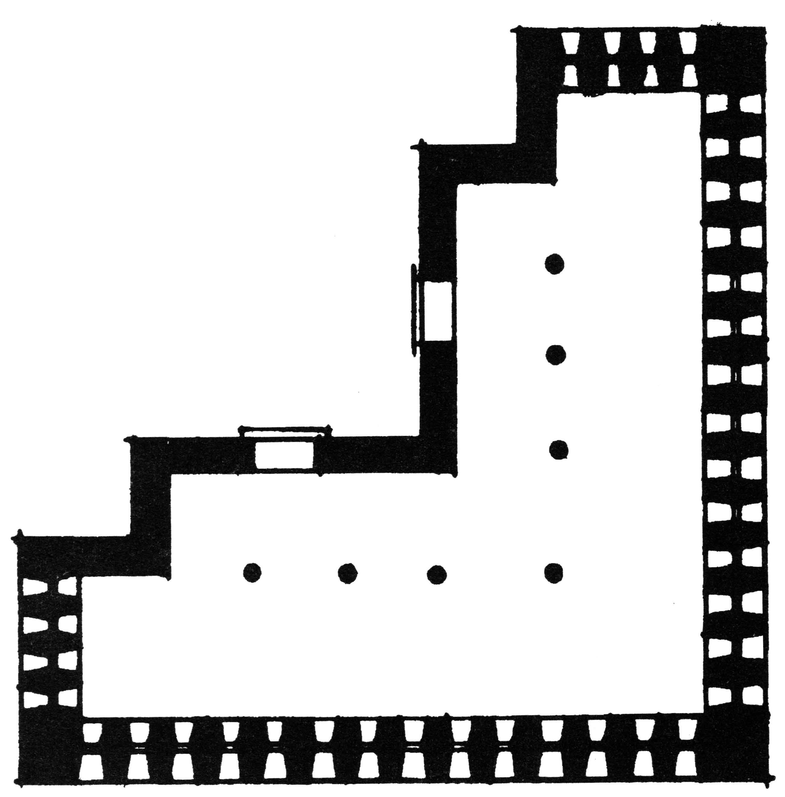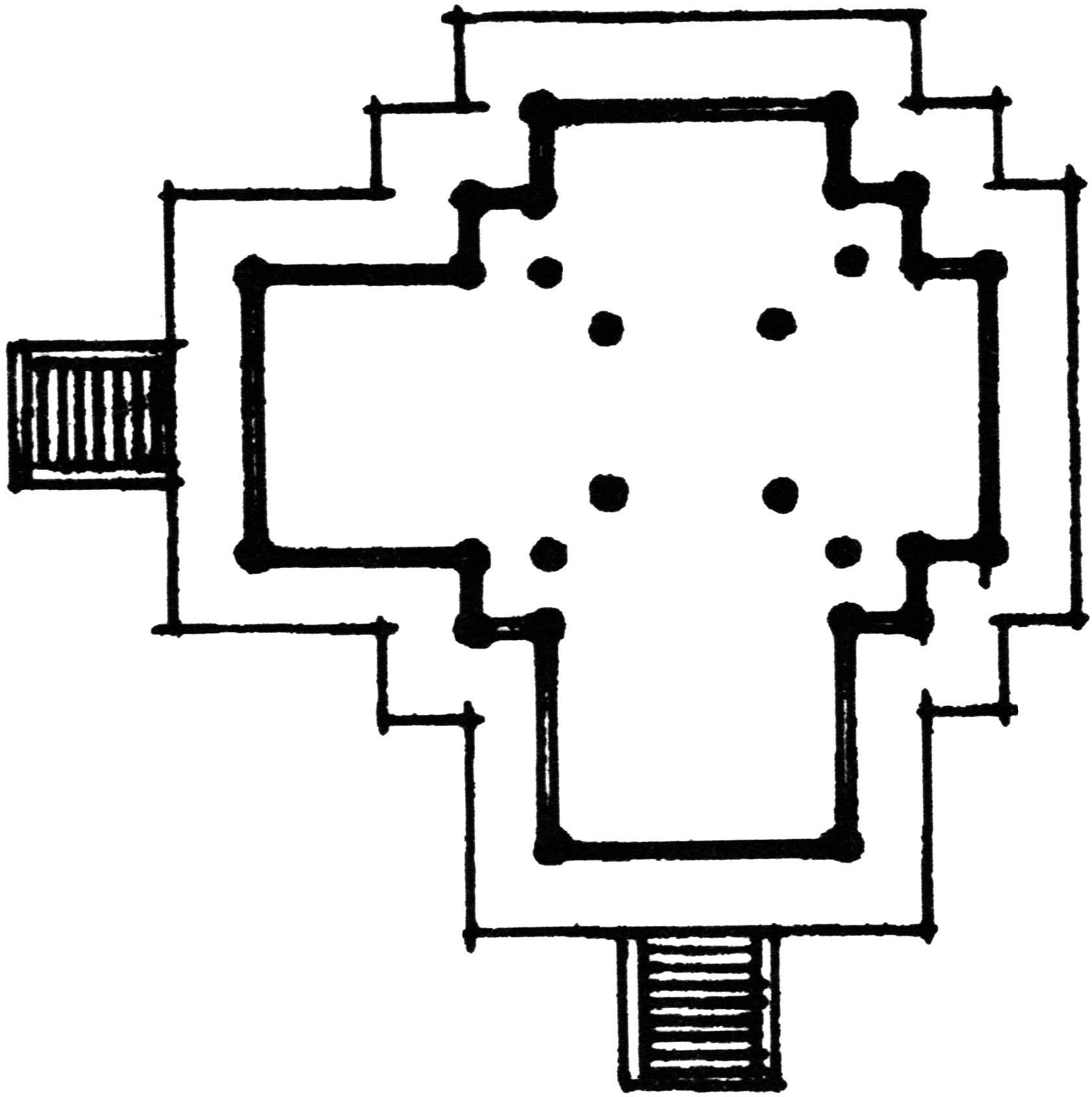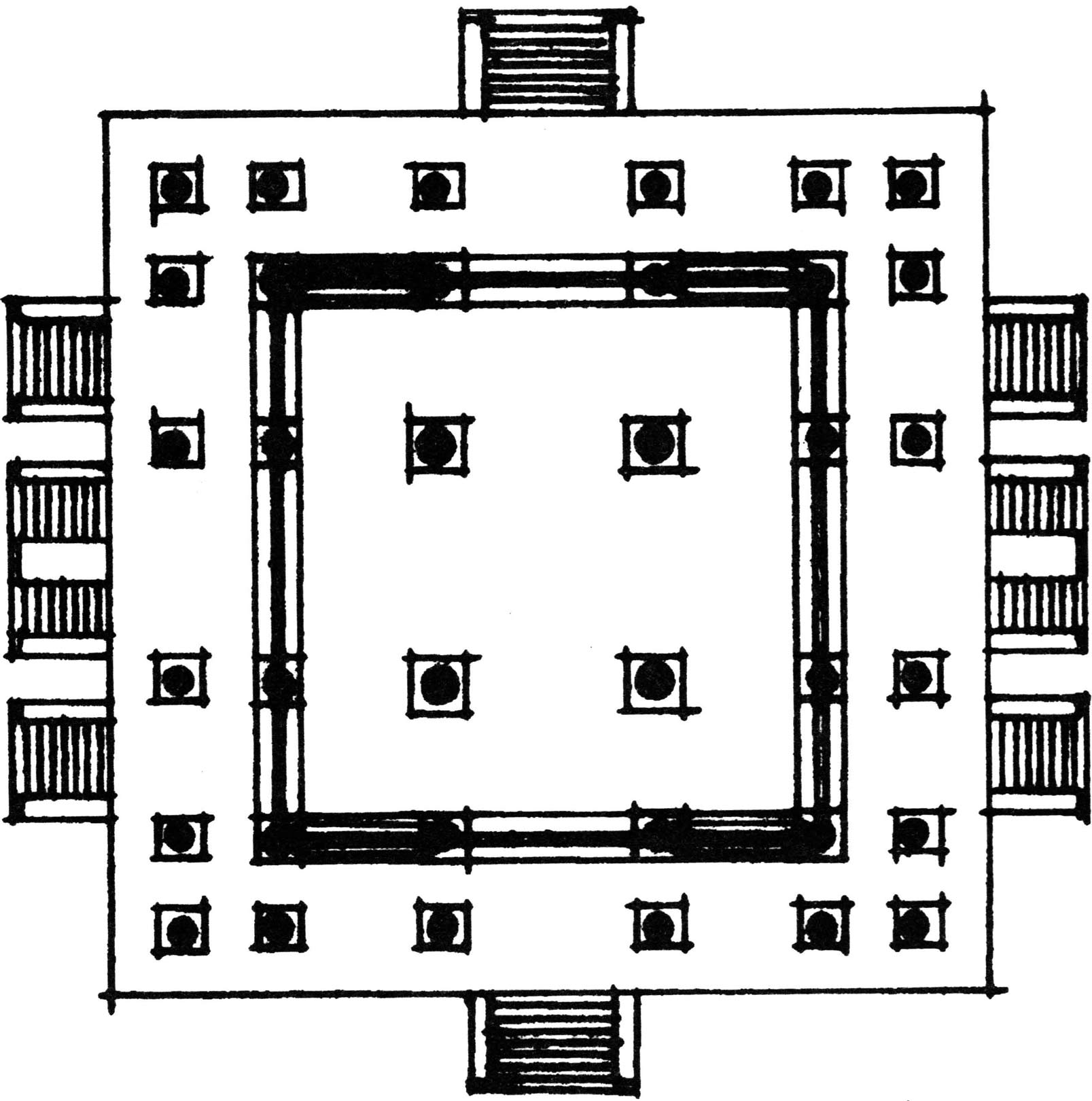 平面的形式以长方形为最普通,举凡北平故宫主要宫殿(图十一及图十二)或一般平民住宅,都以长方形为主。正方形也有用作主要建筑的,如中和殿(图十三及图十四)及辟雍。六角形(图十五)八角形多半是点缀庭园的建筑。圆形却大半是隆重的大建筑物,如天坛的祈年殿(图十六及图十七)和皇穹宇。复杂的形体如城墙上的角楼是曲尺形(图十八及图十九)或十字形(图二十及图二十一),或如带雨搭的箭楼(图二十二及图二十三),都是多数的长方形相聚而成。