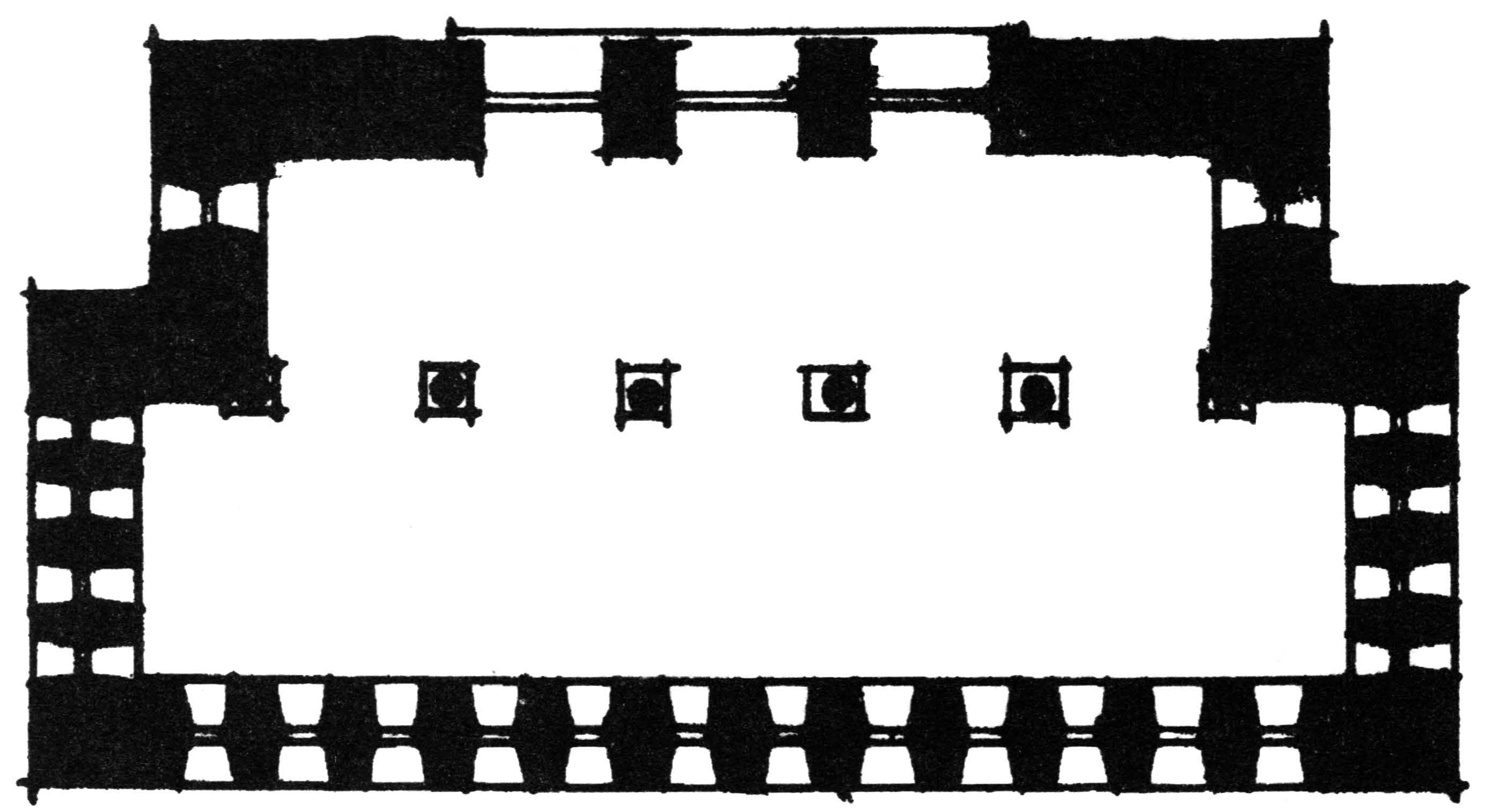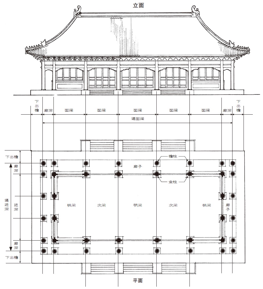 一座建筑物的平面有两种度量——宽与深;两者之中,较长者叫宽,较短者叫深。中国建筑因特有的构架制度,先用立柱横梁构成屋架,然后加筑墙壁或槅扇,所以柱之分布,便成为平面配置上最重要的一个原素,凡在四柱之中的面积,都称为间。间之宽(在建筑物长面之长度)称为面阔;全建筑物若干间合起来的长度称通面阔。间之深(在建筑物短面之长度)称为进深;若干间合起来的长度称通进深(图八)。