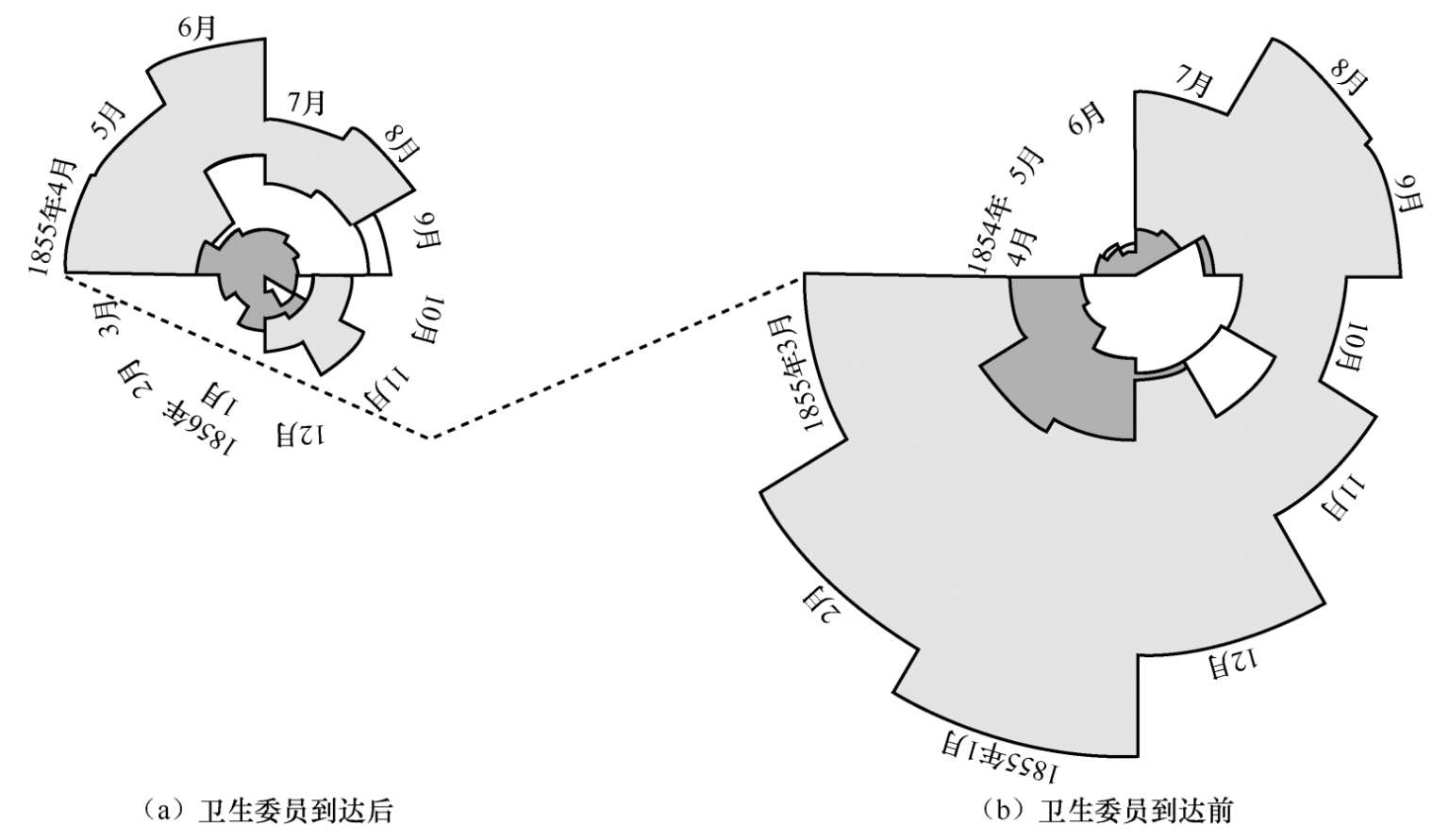 ② 图1-3(a)中的扇形面积远小于图1-3(b)中的扇形面积。这说明卫生委员到达后(1855年3月),死亡人数明显下降,证明卫生环境的改善带来的效果。