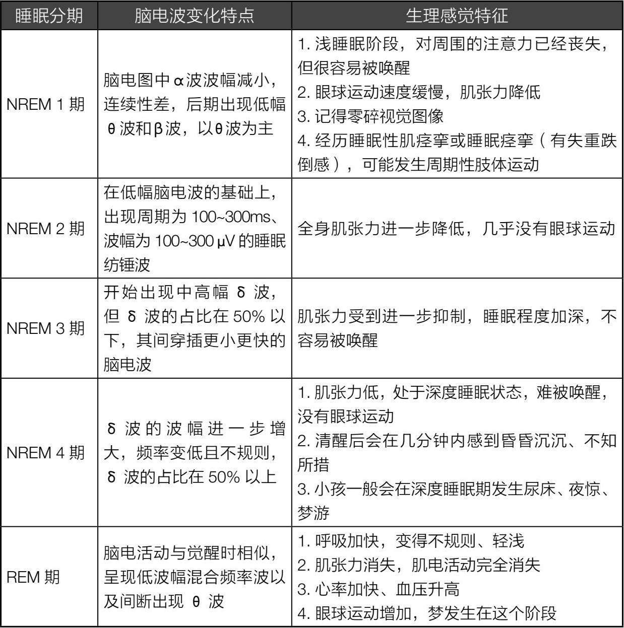 表1-1 不同睡眠分期的脑电波变化特点及生理感觉特征