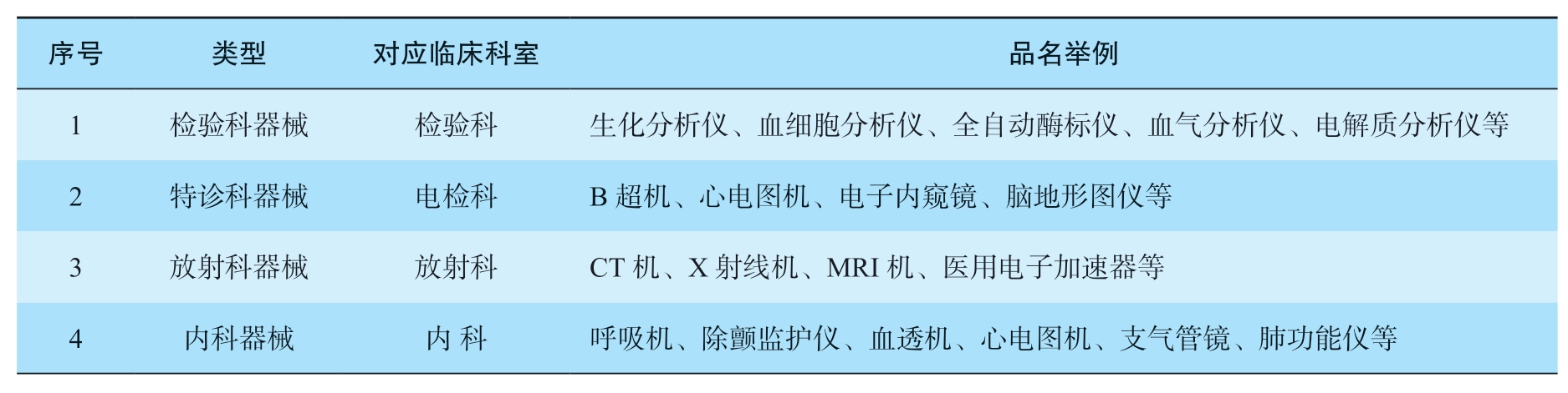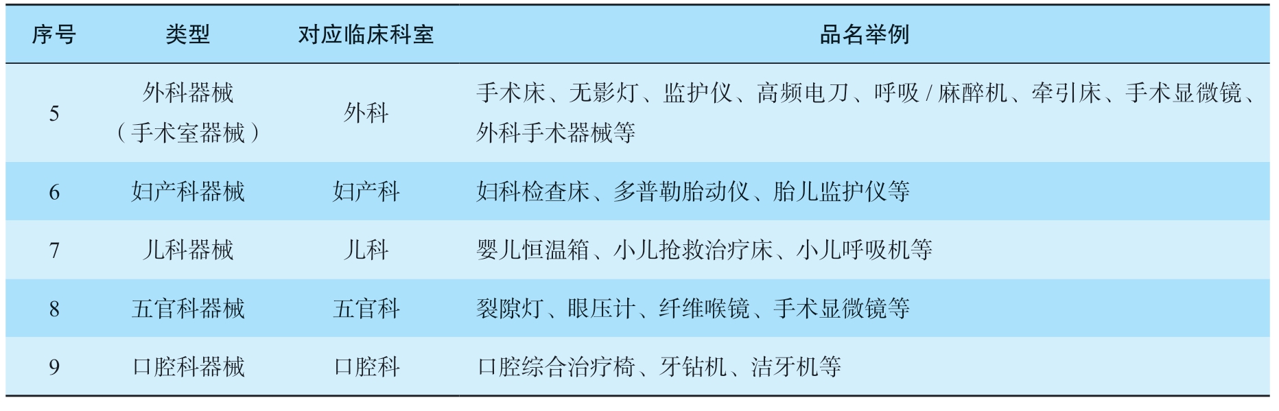 6.按临床应用分类 许多医疗机构特别是医院常根据其医院管理的模式和方便性把医疗器械按设备所适用的临床科目进行分类,见表3-2。