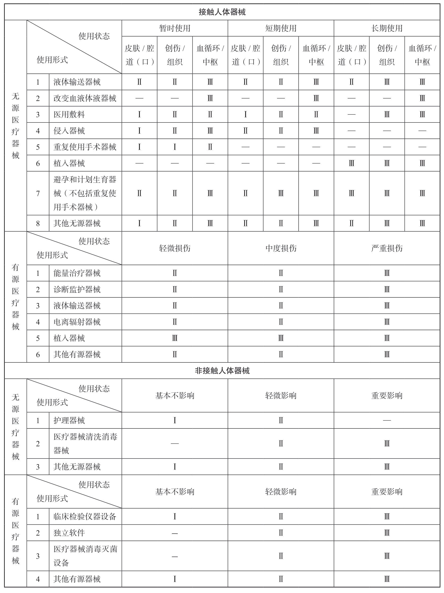 注:1.本表中“Ⅰ”“Ⅱ”“Ⅲ”分别代表第一类、第二类、第三类医疗器械。
