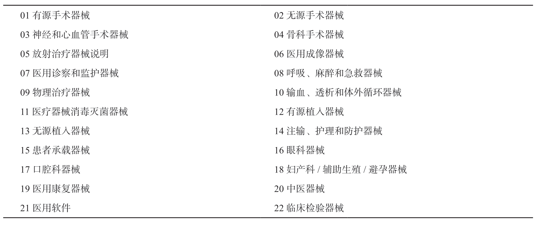 根据《医疗器械分类规则》规定,《医疗器械分类目录》是将部分已上市产品按《医疗器械分类规则》规定的分类原则进行划分。医疗器械行业经过10余年的高速发展,产品种类增长迅速,技术复杂的产品不断涌现,2018年在2002版目录基础上新版《医疗器械分类规则》发布实施,主要以技术领域为主线,更侧重从医疗器械的功能和临床使用的角度划分产品归属,分为22个子目录,子目录由一级产品类别、二级产品类别、产品描述、预期用途、品名举例和管理类别组成,见表3-4。由于医疗器械产品本身品种繁多,因此不可能将已上市产品全部罗列出来,《医疗器械分类目录》只能采用产品列举法。根据医疗器械风险变化情况,参考国际经验,遵循符合最新科学认知、立足监管实际、鼓励创新、推动产业高质量发展的原则进行动态调整。随着科学技术水平的日益发展和医疗器械监督管理能力的不断提高,预示着第一类、第二类管理产品比重不断增加和第三类产品不断减少将是一个必然的趋势。