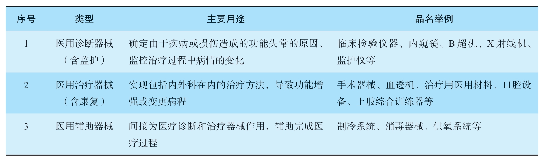 医疗器械的安全有效直接关系人民群众身体健康和社会和谐稳定,是重大的民生和公共安全问题。《医疗器械监督管理条例》(2021年6月)规定:“医疗器械,是指直接或者间接用于人体的仪器、设备、器具、体外诊断试剂及校准物、材料以及其他类似或者相关的物品,包括所需要的计算机软件”。医疗器械的效用主要通过物理等方式获得,不是通过药理学、免疫学或者代谢的方式获得,或者虽然有这些方式参与,但是只起辅助作用。其目的是:①疾病的诊断、预防、监护、治疗或者缓解。②损伤的诊断、监护、治疗、缓解或者功能补偿。③生理结构或者生理过程的检验、替代、调节或者支持。④生命的支持或者维持。⑤妊娠控制。⑥通过对来自人体的样本进行检查,为医疗或者诊断目的提供信息。