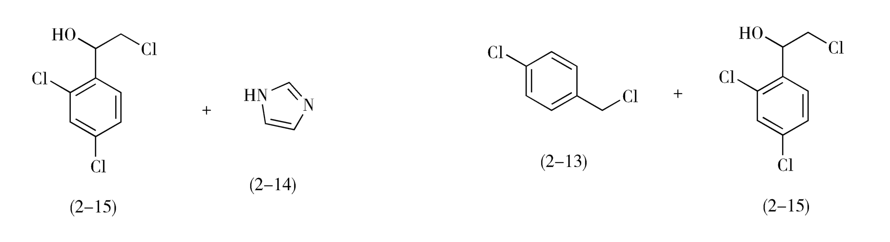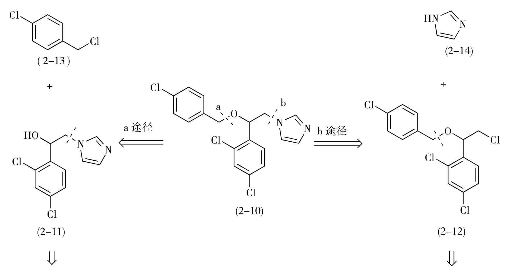 从虚线b处断开C—N,前体为咪唑(2-14)和2-(4-氯苯甲氧基)-2-(2,4-二氯苯基)氯乙烷(2-12)。2-12进一步分拆,前体为对氯甲基氯苯(2-13)和1-(2,4-二氯苯基)-2-氯代乙醇(2-15)。