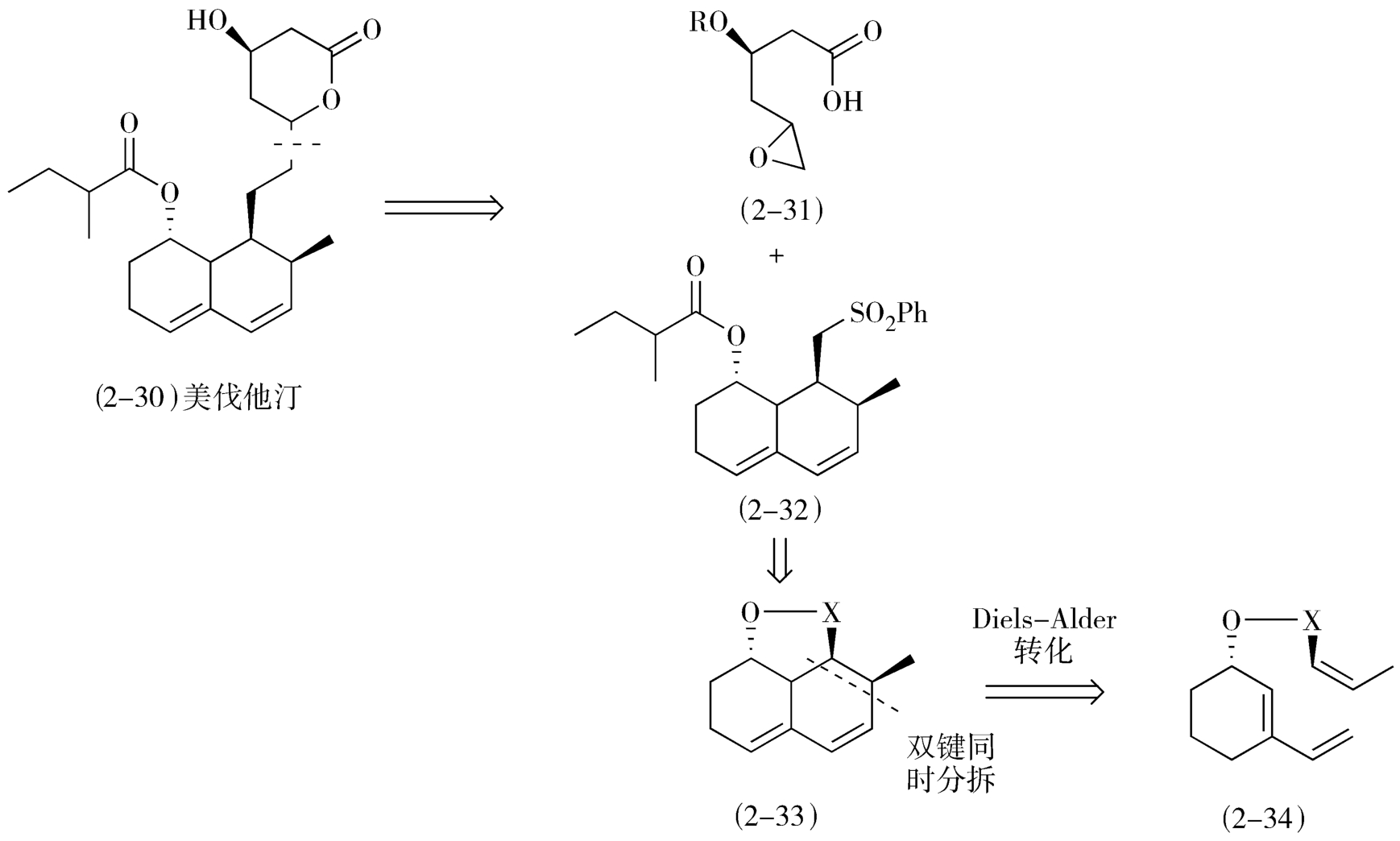 从合成反应优化合成转化顺序首先可以寻求多键分拆的策略:通过一步合成反应同时建立多个化学键是简化合成步骤的有效方法。上文谈到的哌替啶和西来曲葆的合成实际上都应用了这个策略。在设计降血脂他汀类药物美伐他汀(mevastatin,2-30)的逆合成路线时也应用了基于协同反应的多键分拆策略(图2-14)。