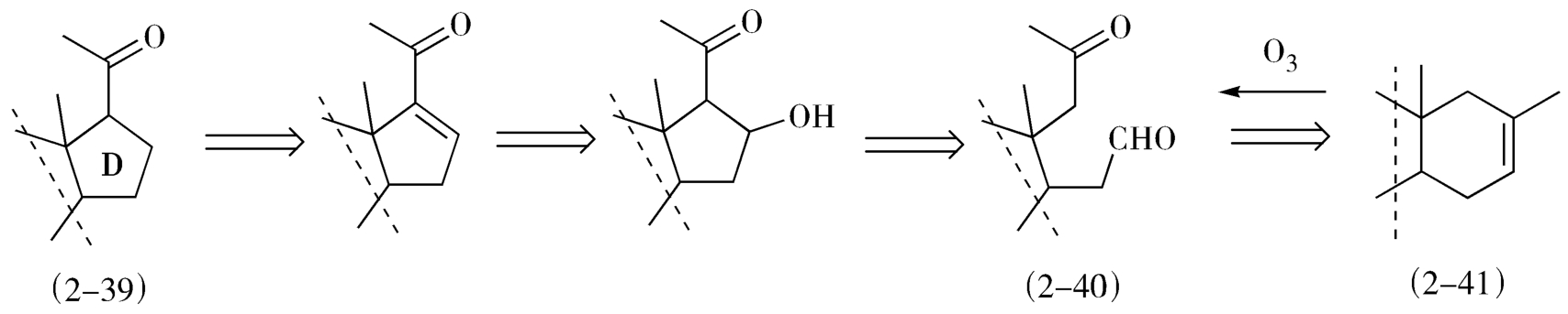 联接法也是十分有用的逆合成分析方法,如经典的甾体全合成中D环(2-39)的形成,是将带有甲基酮侧链的D环推导得醛酮的中间体(2-40),而此中间体可用连接法推导得到其前体甲基环己烯(2-41),这里依据的是臭氧氧化反应(图2-17)。
