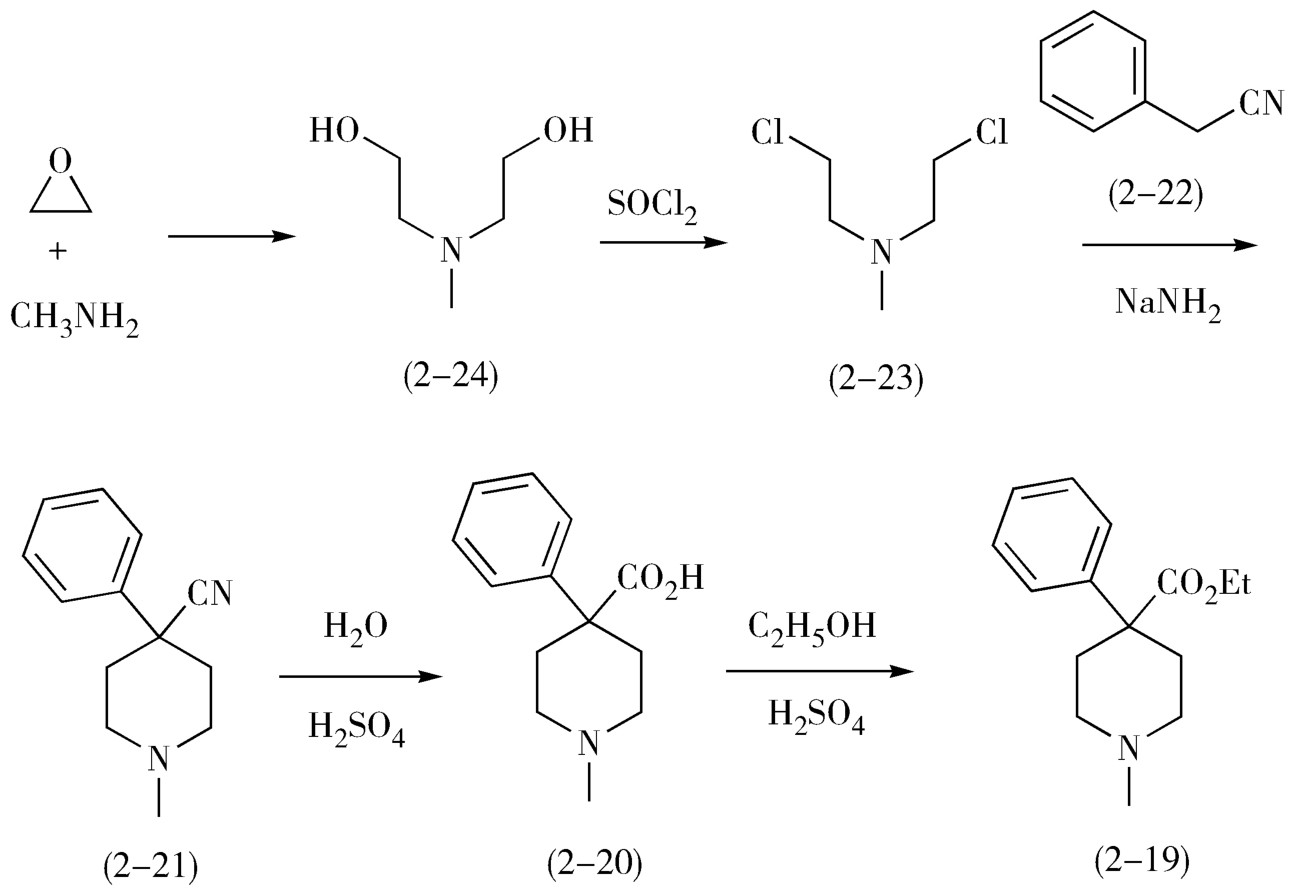 在本品的合成过程中,首先是使用环氧乙烷和甲胺发生氮烷基化反应,生成二(β-羟乙基)甲胺(2-24),然后使用氯化亚砜氯化2-24,生成二(β-氯乙基)甲胺(2-23),2-23与活性亚甲基化合物苯乙腈(2-22)在碱性条件(胺基钠)下缩合关脂肪环得到4-苯基-4-氰基哌啶(2-21),2-21在酸性条件下水解、酯化生成哌替啶(2-19)。