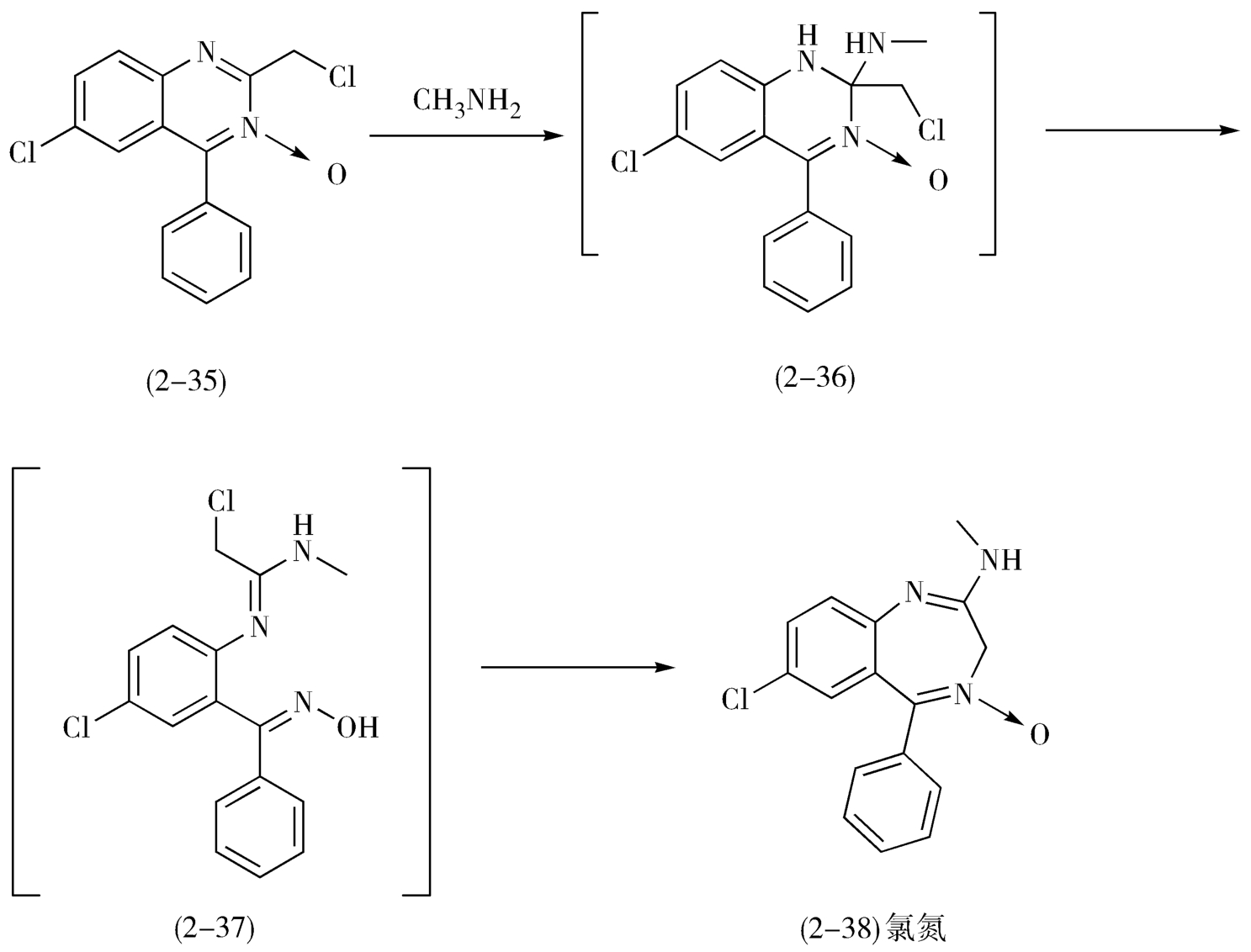 (chlordiazepoxide,2-38)的合成就是利用了2-氯甲基-4-苯基-6-氯-喹唑啉-3-氧化物(2-35)的扩环重排获得的(图2-16)。
