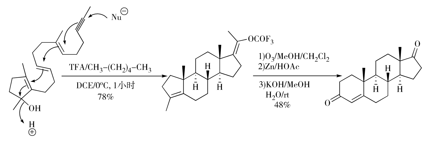 Johnson甾体合成法利用了含氧基团电性效应引发的仿生-烯烃多重环合反应,可在此反应中同时建立三个碳-碳键和三个脂环,是合成甾体药物的理想方法(图2-15)。