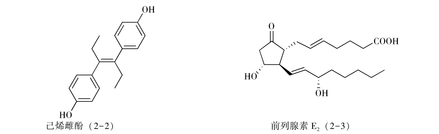 1.分子考察 考虑对一个特定药物进行合成,第一步是对这个药物分子的结构特征和理化性质进行收集和考察,由此可以简化合成中的问题或避免不必要的弯路。例如,非甾体雌激素药物己烯雌酚(diethylstilbestrol,2-2)的分子带有明显的对称性,因此可以考虑只合成一部分结构单元,采用分子对接的方法合成目标药物分子,从而简化合成步骤(详见分子对称法);而在考虑前列腺素E 2 (2-3)的合成时,由于已知分子中β-羰基酮体系是不稳定的,因此可以安排在合成的最后几步形成这一结构单元,使其避免经历较多的化学反应。