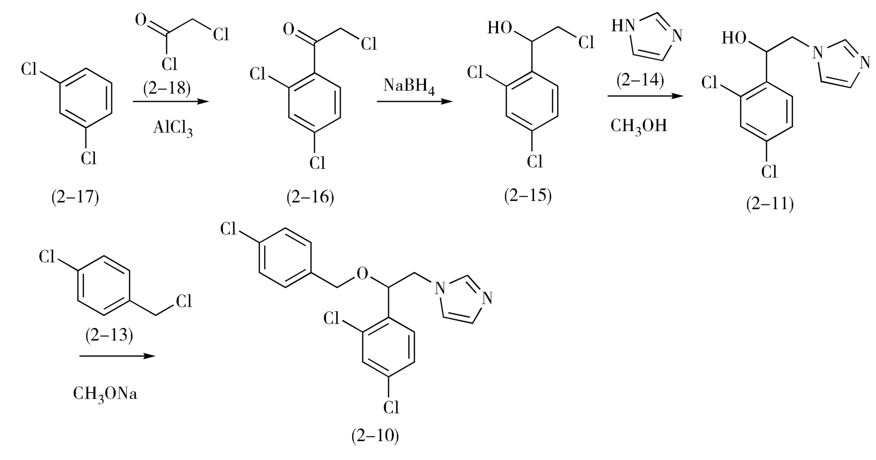 如图2-8所示,1-(2,4-二氯苯基)-2-氯代乙醇(2-15)是一个仲醇,可由相应的酮还原制得,而其前体α-氯代-2,4-二氯苯乙酮(2-16)可由2,4-二氯苯(2-17)与氯乙酰氯(2-18)经Friedel-Crafts反应制备。益康唑的合成如下(图2-9)。