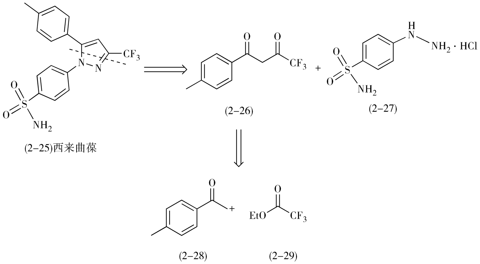 例如,1998年上市的非甾体抗炎药环氧化酶-2选择性抑制剂西来曲葆(celebrex,2-25)的逆合成路线,首先选择在位于分子中部的吡唑处分拆分子,形成二酮(2-26)与4-磺酸氨基苯肼盐酸盐(2-27),二酮(2-26)可由4-甲基苯乙酮(2-28)和三氟乙酸乙酯(2-29)通过Claisen缩合反应制得(图2-12)。