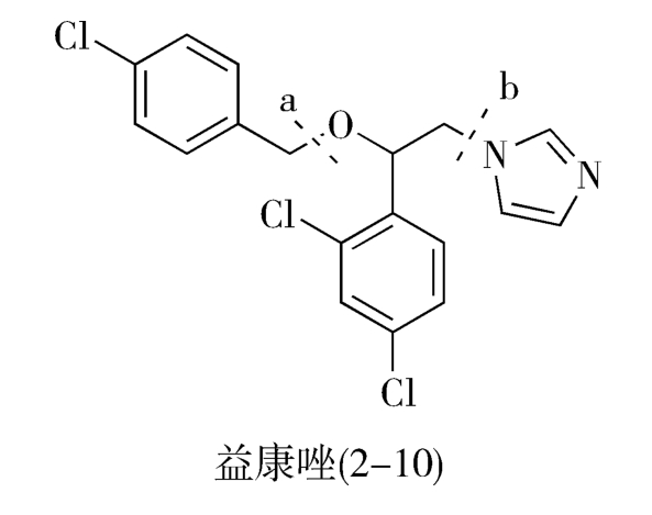 如图2-7所示,从虚线a处断开C—O键,益康唑的前体为对氯甲基氯苯(2-13)和1-(2,4-二氯苯基)-2-(1-咪唑基)乙醇(2-11);2-11继续分拆,得到1-(2,4-二氯苯基)-2-氯代乙醇(2-15)和咪唑(2-14)。