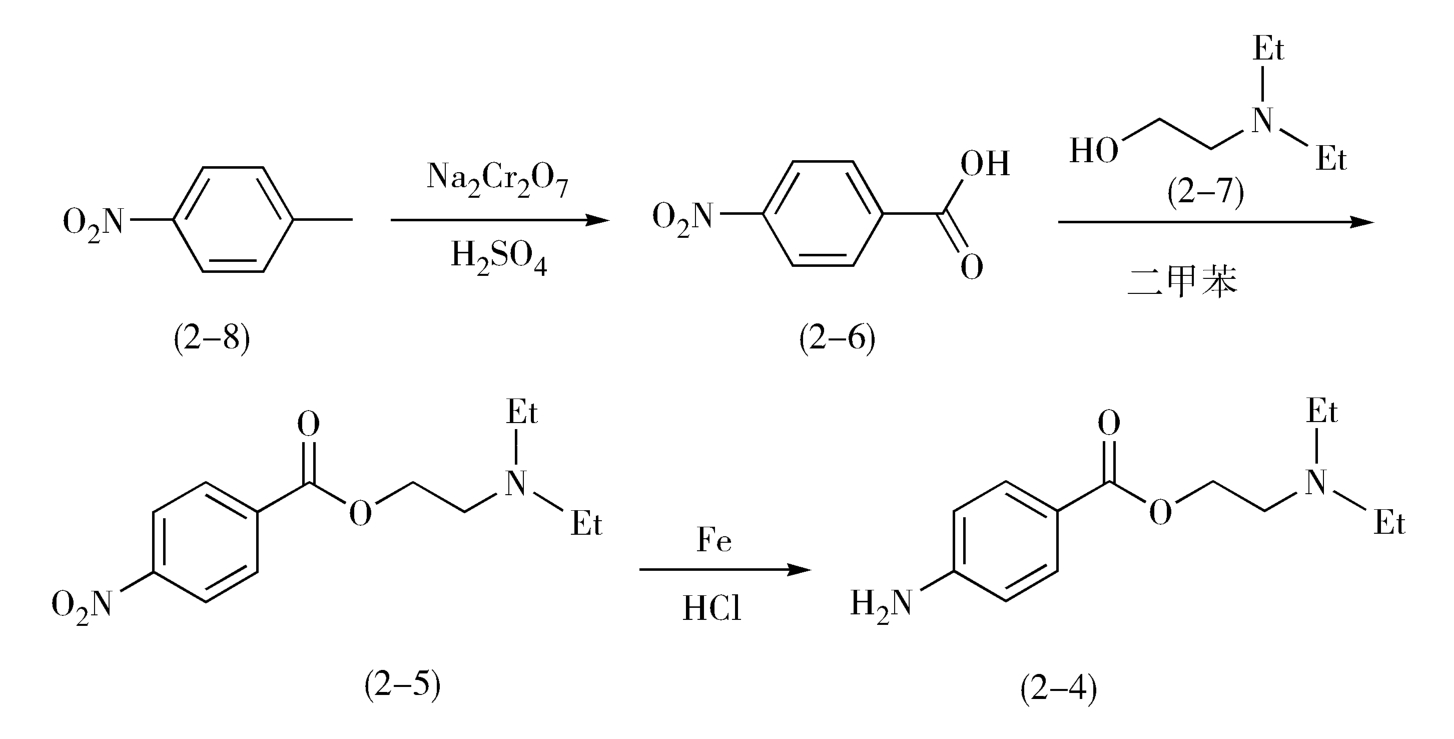 在合成普鲁卡因(2-4)的过程中,以重铬酸钠氧化对硝基甲苯(2-8),生成对硝基苯甲酸(2-6),再与二乙胺基乙醇(2-7)进行酯化反应,经二甲苯共沸脱水得硝基卡因(2-5),(2-5)再于稀盐酸中用铁粉还原即得产物(图2-4)。