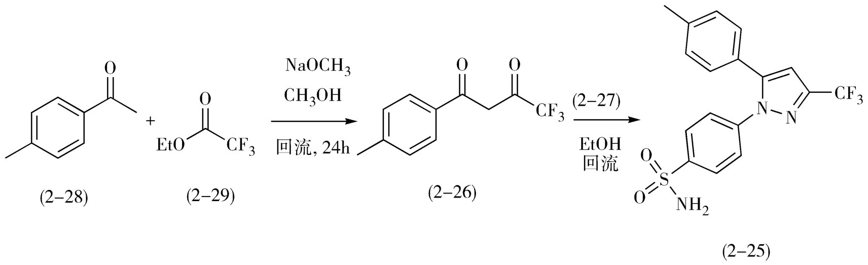 将4-甲基苯乙酮(2-28)和三氟乙酸乙酯(2-29)在甲醇钠存在下、甲醇中回流,分子间缩合制备二酮2-26,2-26与4-磺酸氨基苯肼盐酸盐(2-27),在乙醇中回流缩合即得目标分子西来曲葆(2-25)。西来曲葆的合成如图2-13。