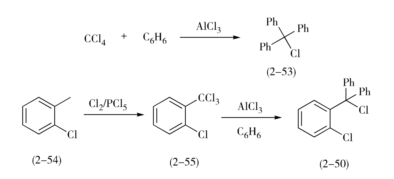 此种合成方法得到的邻氯苯基二苯基氯甲烷(2-50)质量较好,但由于应用了Grignard试剂,因此需要严格的无水条件,对原辅料质量要求比较严格;同时由于使用的溶剂乙醚易燃、易爆,故要求使用的反应设备要有严格的安全措施,使大规模生产受到一定限制。