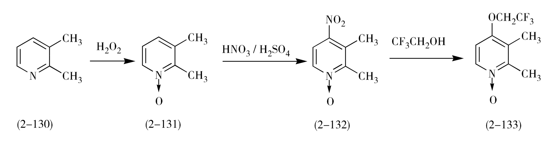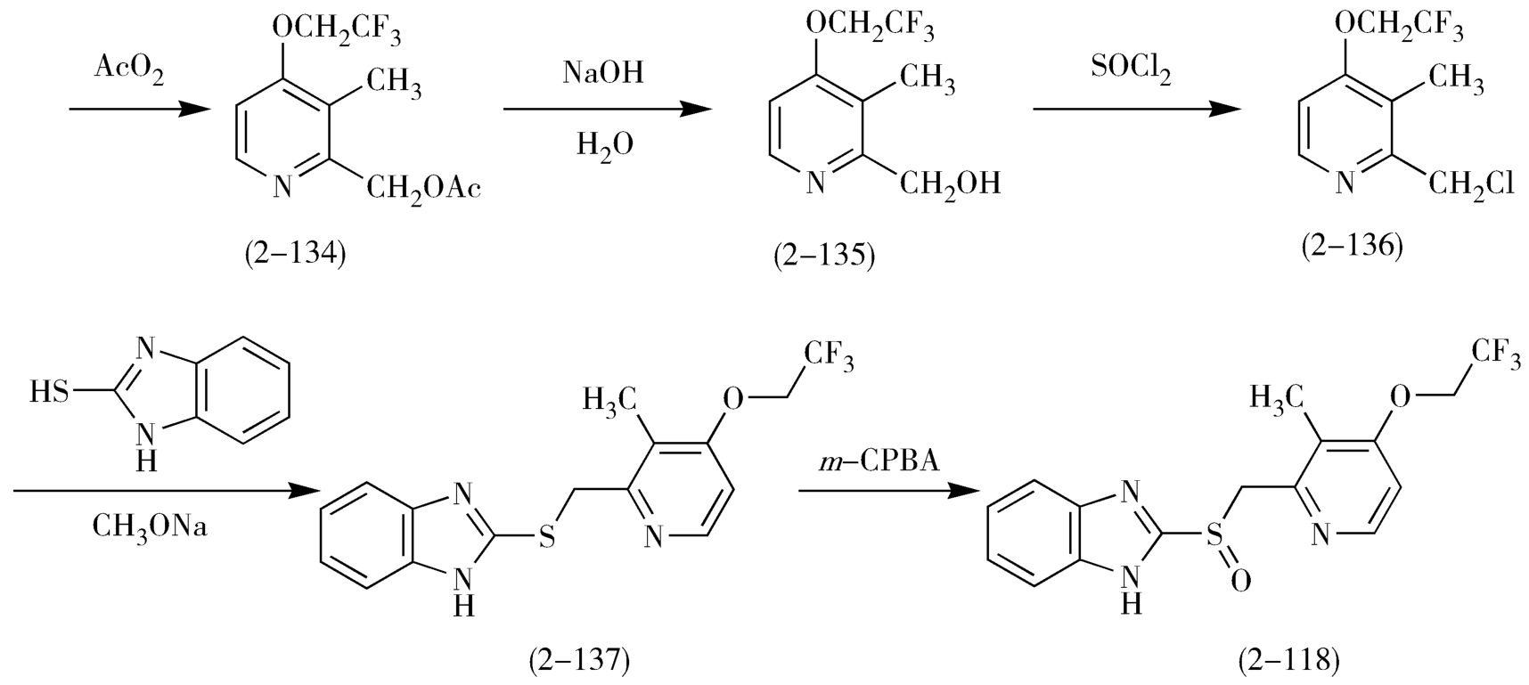 与奥美拉唑的合成类似,兰索拉唑(lansoprazole,2-118)可以2,3-二甲基吡啶(2-130)为起始原料,经氧化、硝化、在乙酐中重排、水解、氯代、取代,最后m-CPBA氧化等7步反应等到(图2-37)。