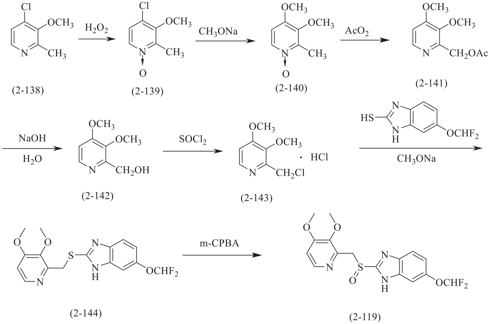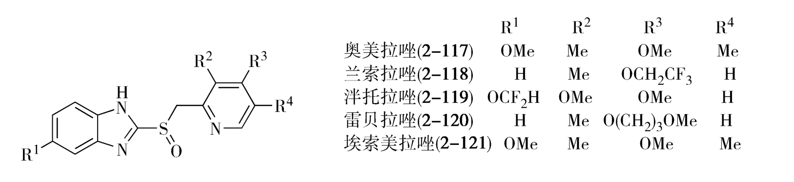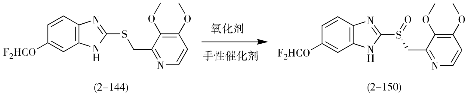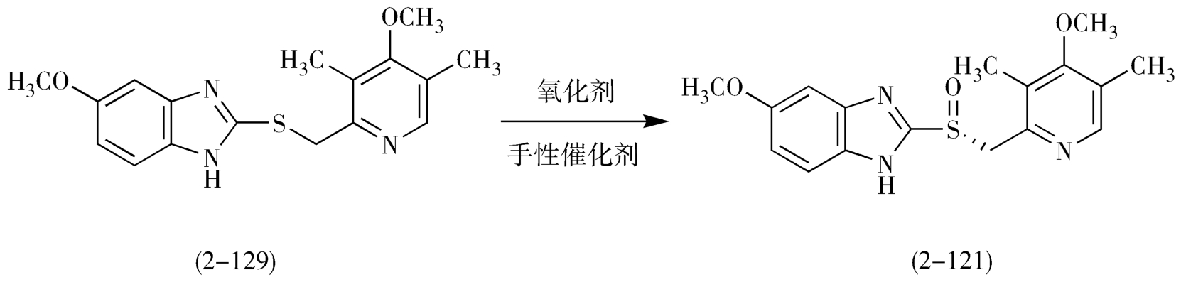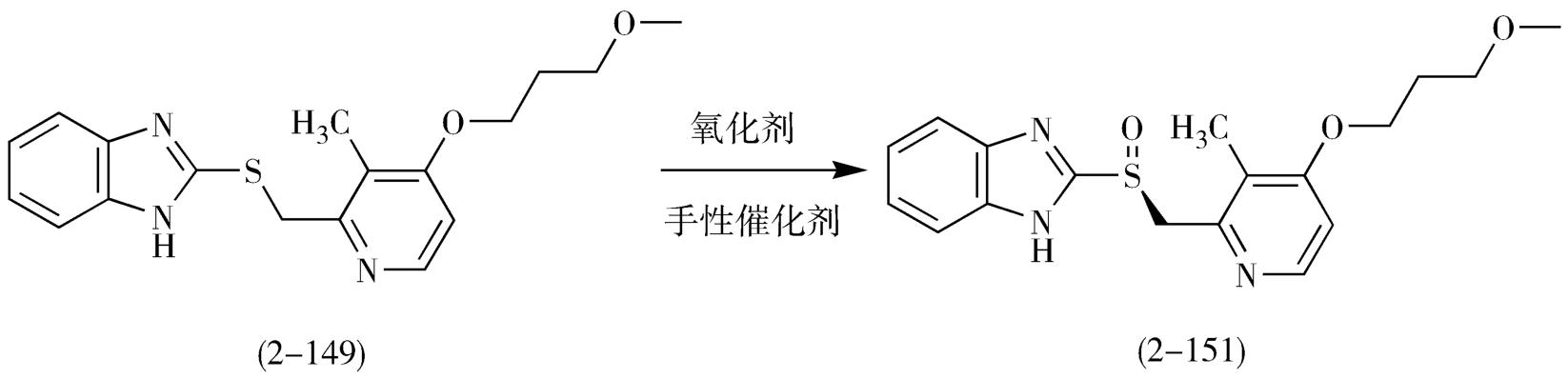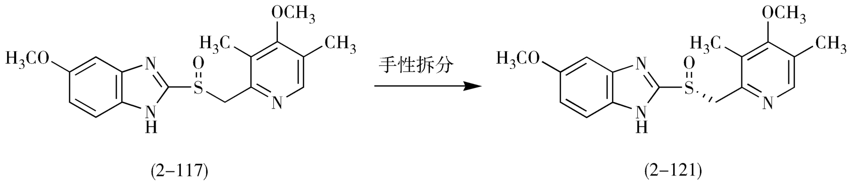 3.质子泵抑制剂的合成方法 质子泵抑制剂(PPI)为H + /K + -ATP酶抑制剂,是最新一类抑制胃酸分泌的药物。这是一类以吡啶甲基亚硫酰基苯并咪唑为基础结构的化合物,目前的质子泵抑制剂是在奥美拉唑(omeprazole,2-117)的合成基础上发展而来的,这些质子泵抑制剂通常采用氧化相应的硫醚化合物来制备,得到的是外消旋混合物,采用特殊氧化方法(如加入手性试剂),可获得单一对映体或富含对映体形式的产物。