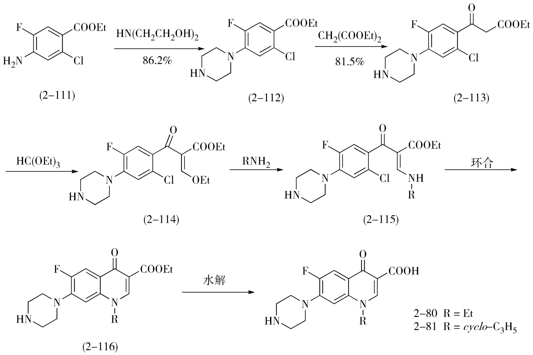 (3)喹诺酮类抗菌药物合成方法的改进:上述合成喹诺酮类抗菌药物的两条工艺路线都比较成熟,但工艺步骤相对较多,特别是都将7位引入哌嗪基的反应放在路线的最后,且收率较低,技术难度较大。近年来人们对喹诺酮类抗菌药物的合成又有新的改进,尤其是对成环工艺改进很大:以2-氯-4-氨基-5-氟苯甲酸乙酯(2-111)为起始原料,后4步总收率可达94.5%(图2-35)。