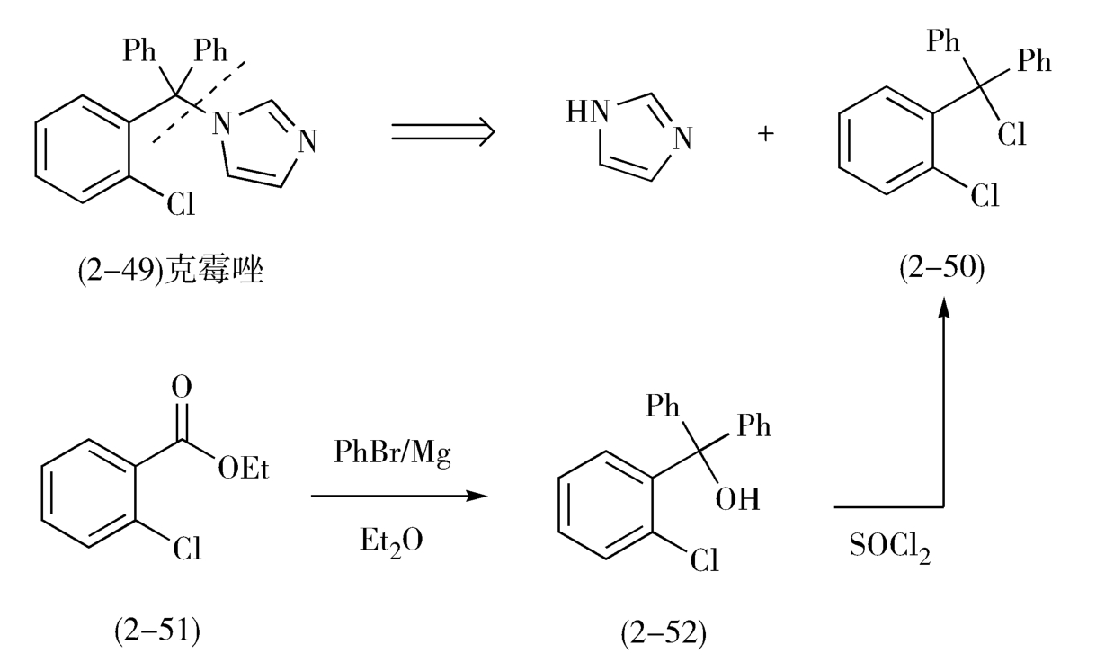 抗真菌药物克霉唑(clotrimazole,2-49)的关键中间体邻氯苯基二苯基氯甲烷(2-50)具有多种合成方法:首先可参考叔醇的合成方法,采用邻氯苯甲酸乙酯(2-51)与溴苯进行Grignard反应,先合成叔醇(2-52),再氯化得到(图2-22)。