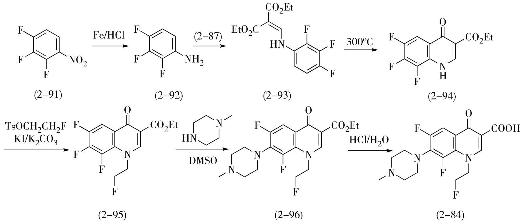 与诺氟沙星的合成类似,氟罗沙星(fleroxacin,2-84)可以2,3,4-三氟硝基苯(2-91)为起始原料,经还原、与EMME缩合、高温环合、氟乙基化、引入 N -甲基哌嗪、酸水解等6步反应得到(图2-31)。