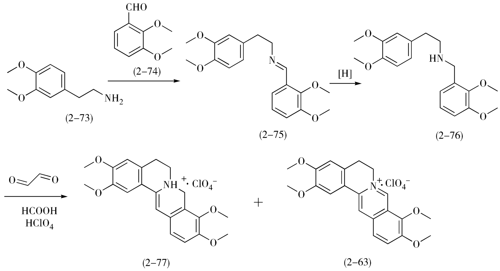 (2)模拟帕马丁的合成方法 1969年Muller等人发表了帕马丁(2-63)的合成方法:使用3,4-二甲氧基苯乙胺(2-73)与2,3-二甲氧基苯甲醛(2-74)进行脱水缩合生成Schiff碱(2-75),并立即将其双键还原转变成苯乙基苯甲基亚胺的骨架(2-76);然后与乙二醛反应,一次引进两个碳原子而合成二苯并[a,g]喹嗪环,按此合成途径得到二氢帕马丁高氯酸盐(2-77)与帕马丁高氯酸盐(2-63)混合物(图2-27)。