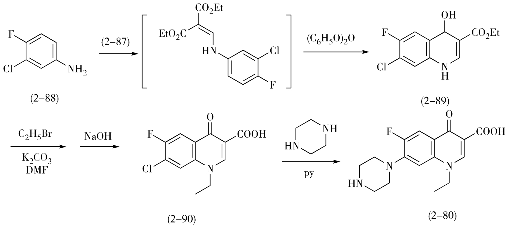 诺氟沙星的合成以3-氯-4-氟苯胺(2-88)为原料,先与EMME脱乙醇缩合,然后在250~260℃加热环合形成吡酮酸结构的2-89,溴乙烷为烃化试剂完成N原子上的乙基化,然后水解,引入哌嗪基,得到诺氟沙星(2-80)(图2-30)。