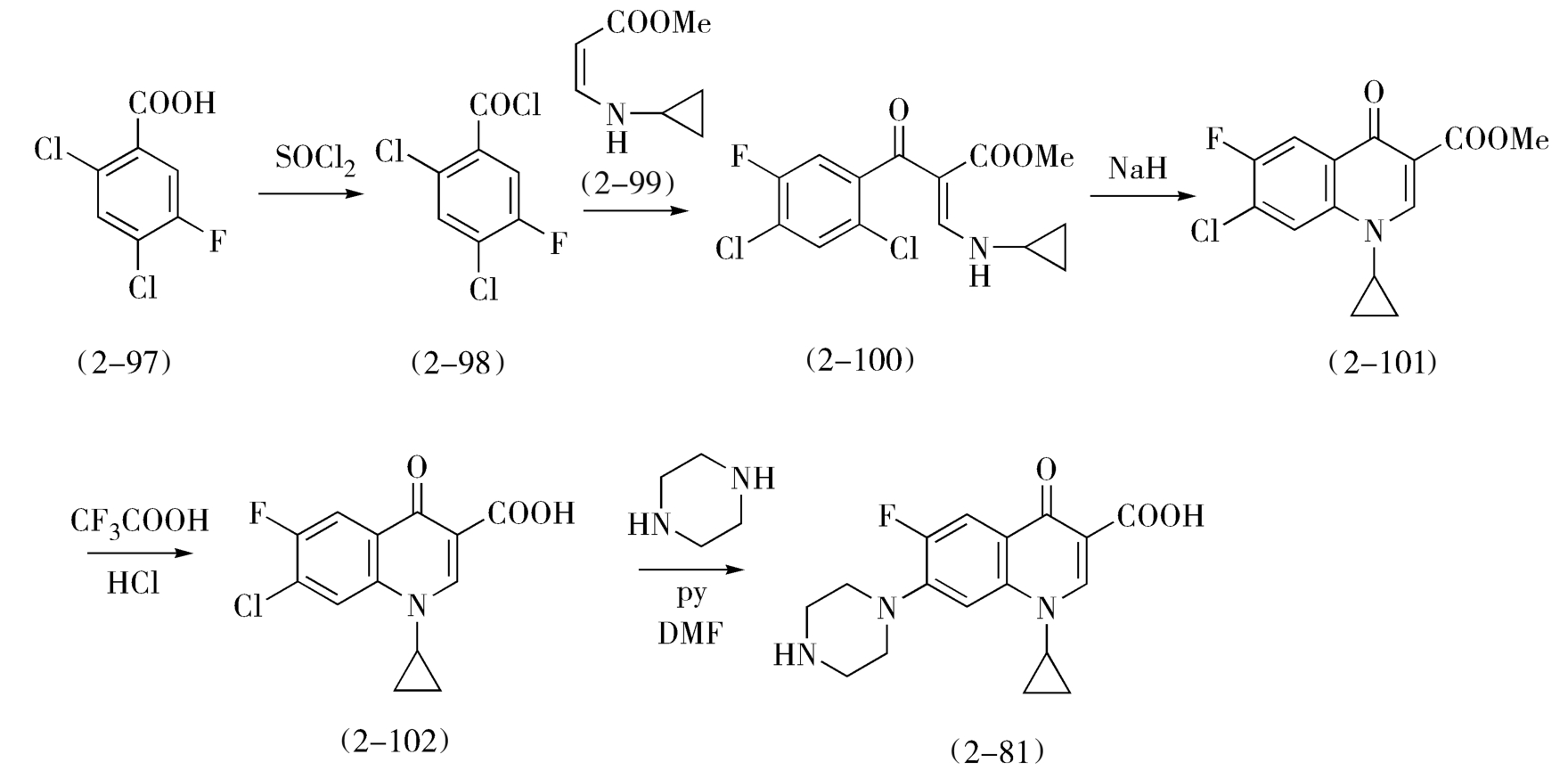 环丙沙星(2-81)与诺氟沙星(2-80)的结构差异在于1位取代基分别为环丙基和乙基,但两者的合成路线却有很大不同。环丙沙星的合成从2,4-二氯-5-氟苯甲酸(2-97)开始,成酰氯后与β-环丙胺丙烯酸甲酯(2-99)缩合,环合、水解,再引入哌嗪基(图2-33)。