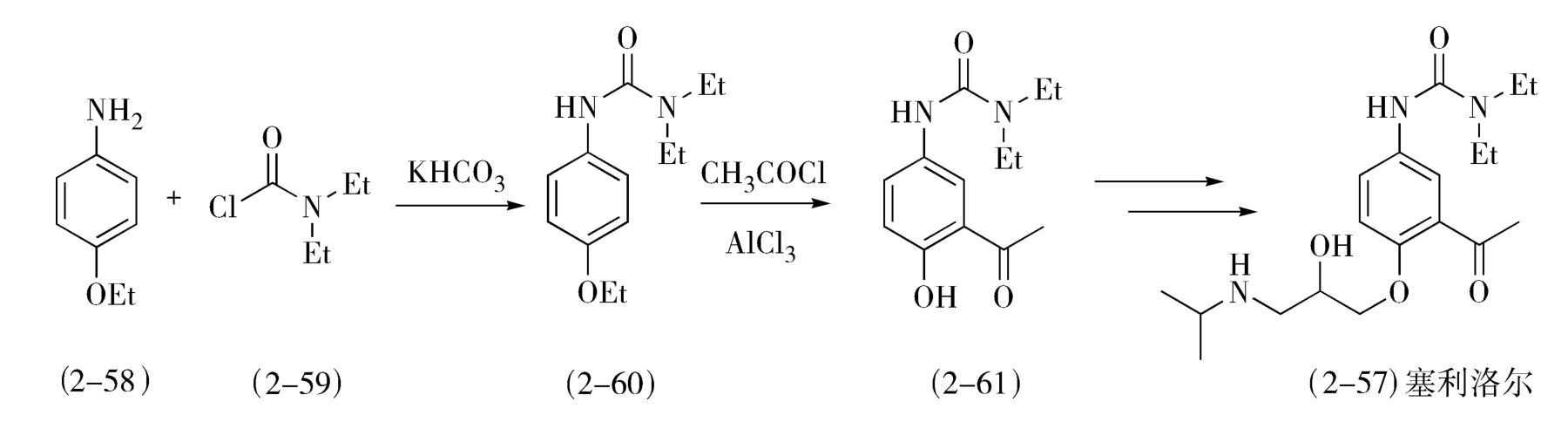 例如,β-受体阻断剂塞利洛尔(celiprolol,2-57)的合成(图2-25),对氨基苯乙醚(2-58)与 N , N -二乙胺基甲酰氯(2-59)作用,生成 N -酰化物(2-60),降低了的氨基的邻、对位定位作用,同时增大了氨基邻位空间位阻,使后面进行的Friedel-Crafts酰化反应发生在酚羟基的邻位,得到2-61;若先进行Friedel-Crafts反应, N -酰化反应居后,则乙酰化反应可同时发生在酚羟基和氨基的邻位,产物复杂。