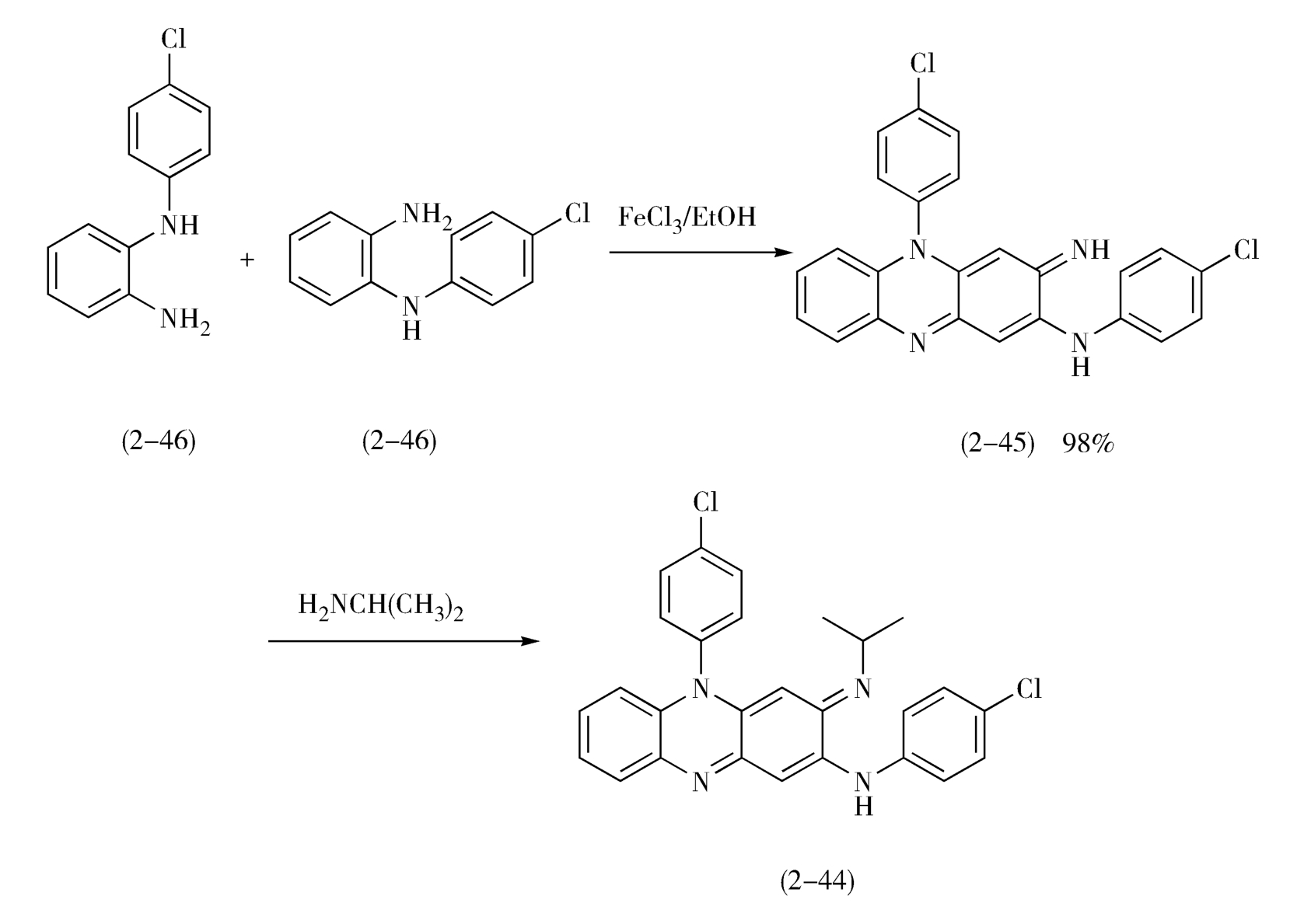 因此,可使用两分子的 N -对氯苯基邻苯二胺(2-46)在三氯化铁存在下进行缩合反应,然后与异丙胺进行加压反应,即可制得氯法齐明(2-44)(图2-20)。